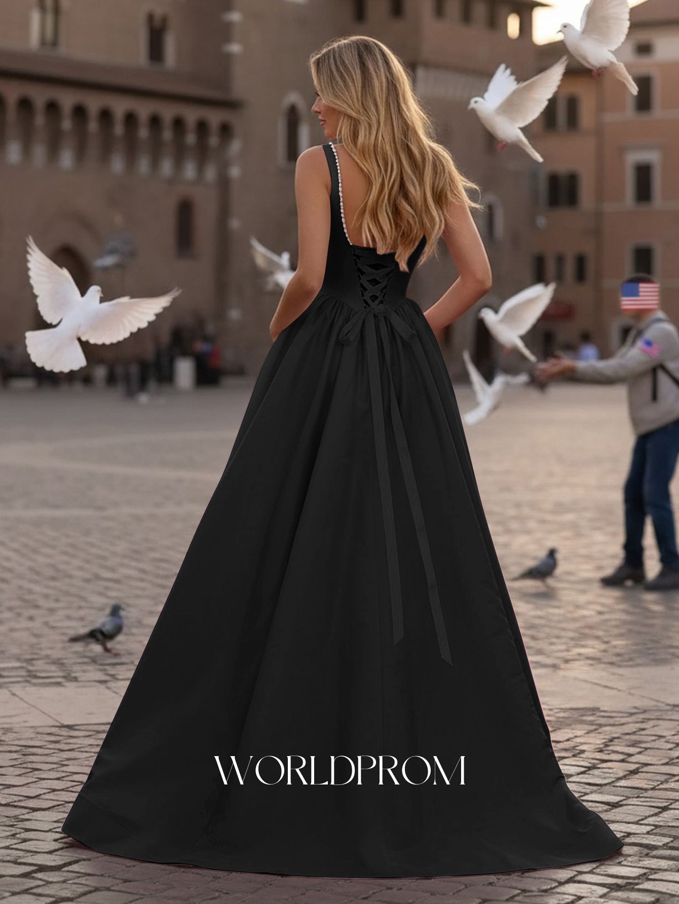 This satin prom gown features corset with pearls like on the bodice. The lace up dress has a square neckline and split hem. Worldprom ball gown prom dresses are ideal for party, evening or festivals.