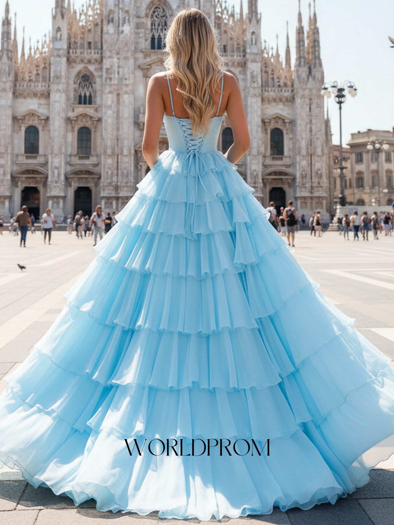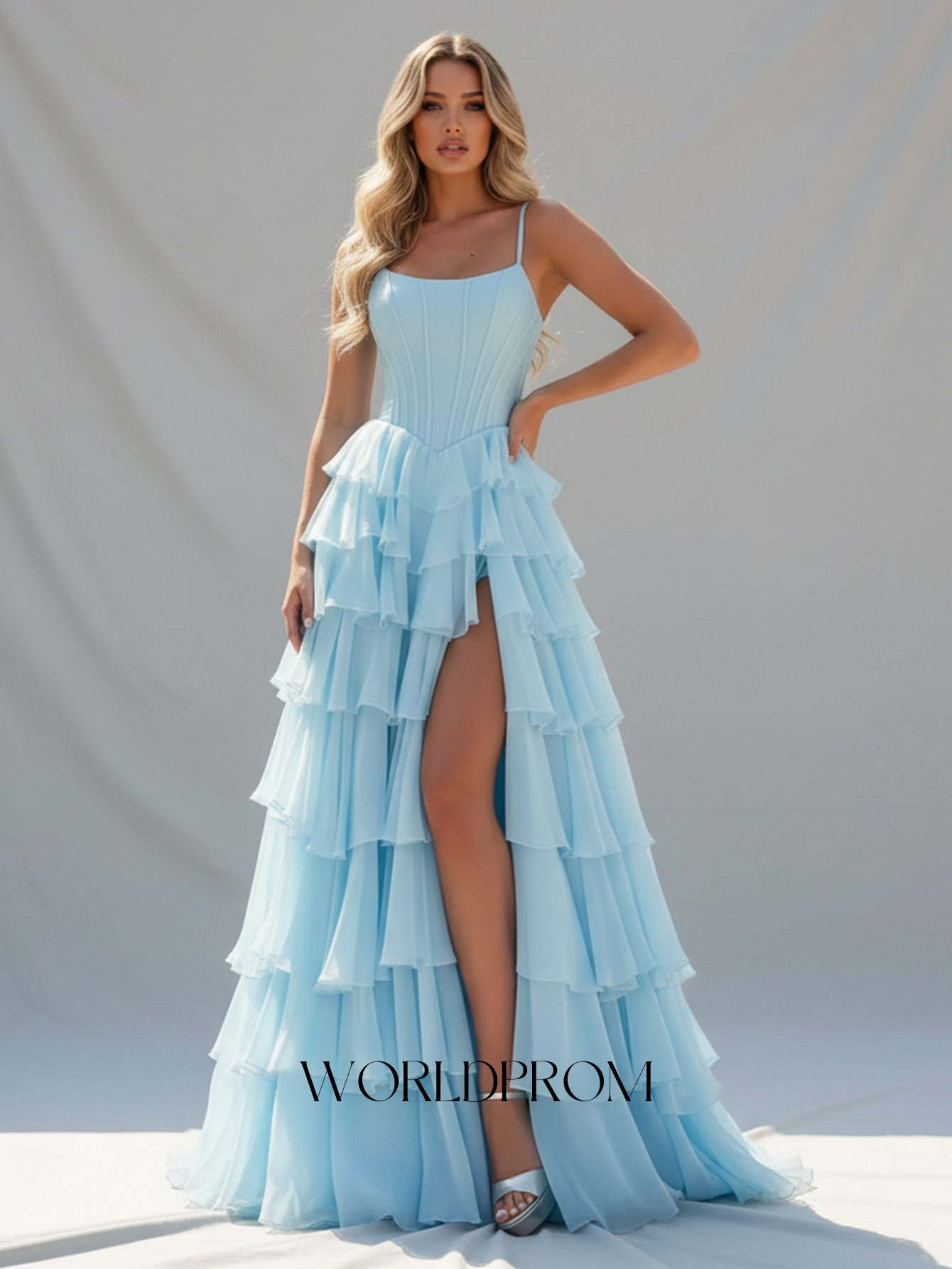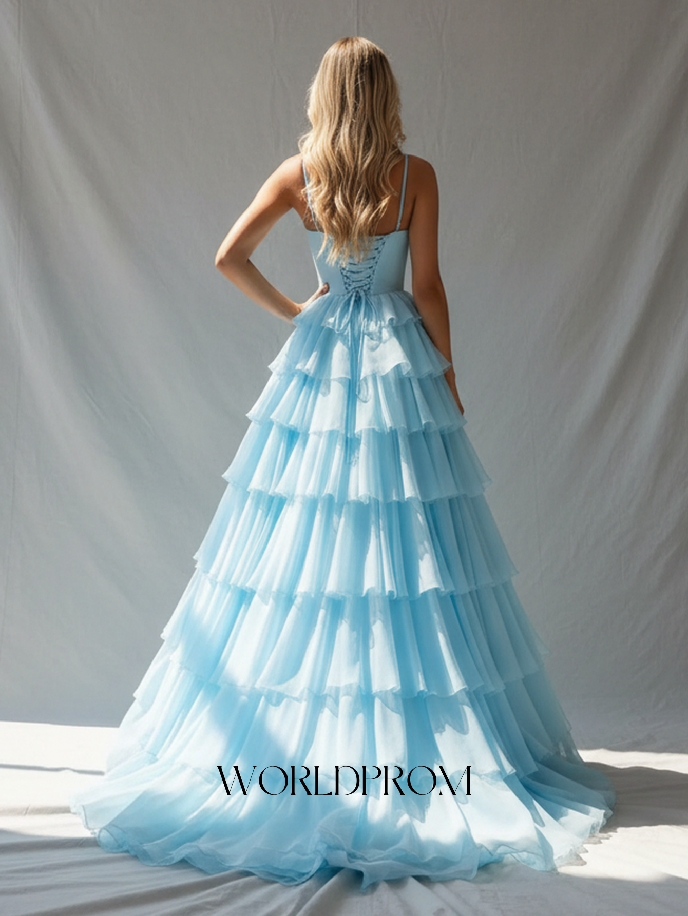Spaghetti Shoulder Straps Pleated Layered Ruffle Hem Long Ball Gown Prom Dress - Light Blue