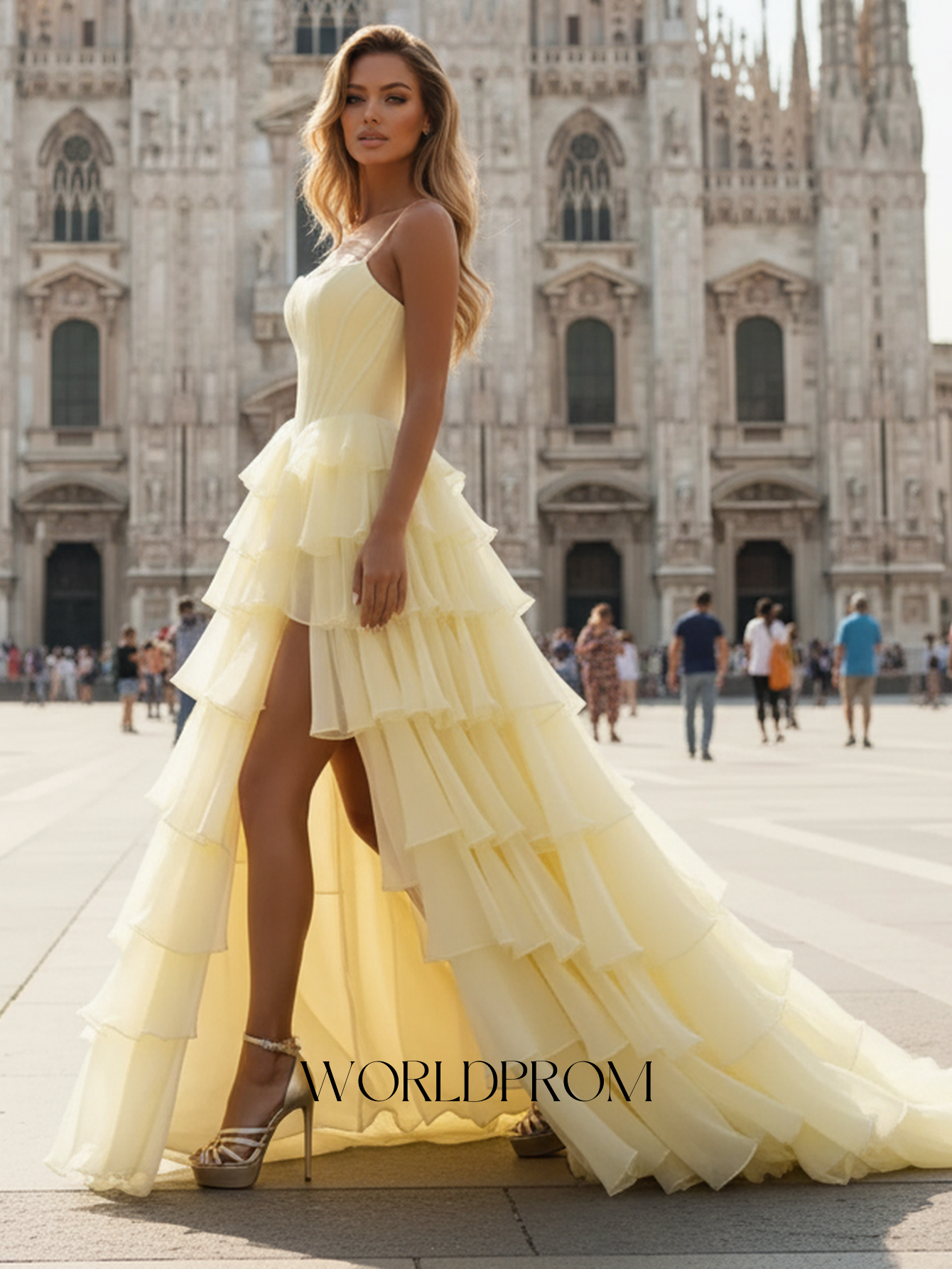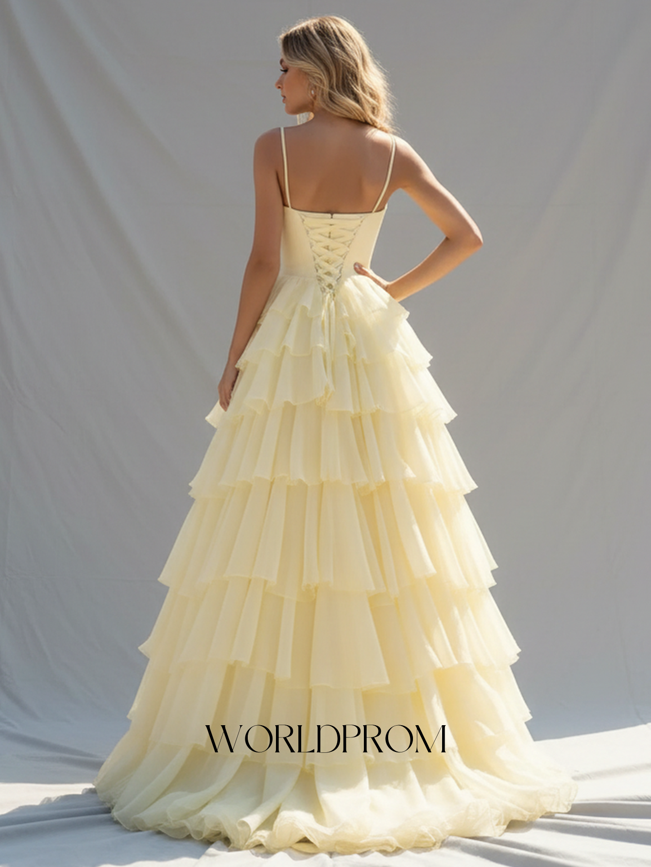 Spaghetti Shoulder Straps Pleated Layered Ruffle Hem Long Ball Gown Prom Dress - Light Yellow