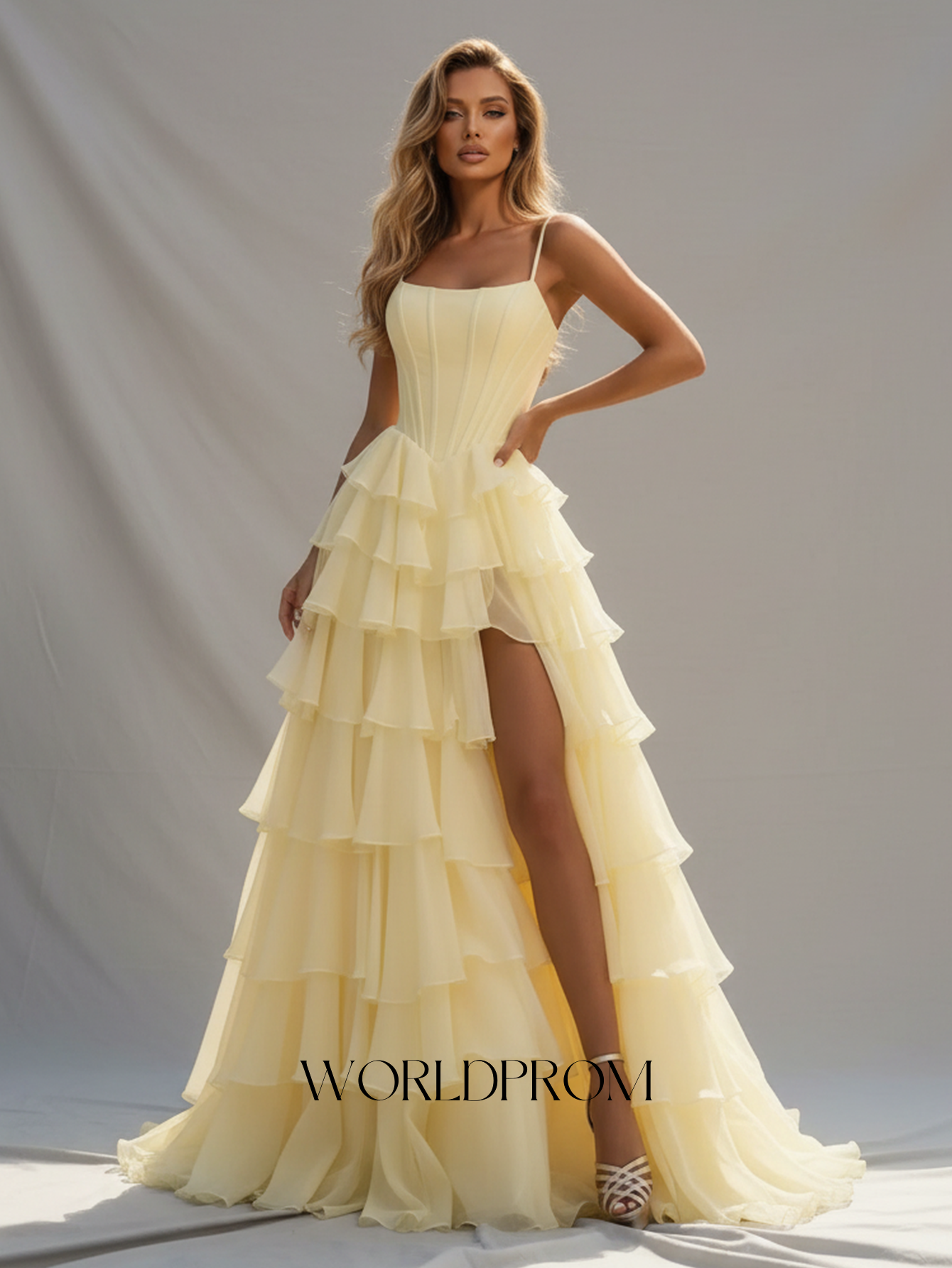This chiffon prom gown features corset on the bodice. The lace up dress has a scoop neckline and layered hem with slit. Worldprom ball gown prom dresses are ideal for party, evening or festivals.