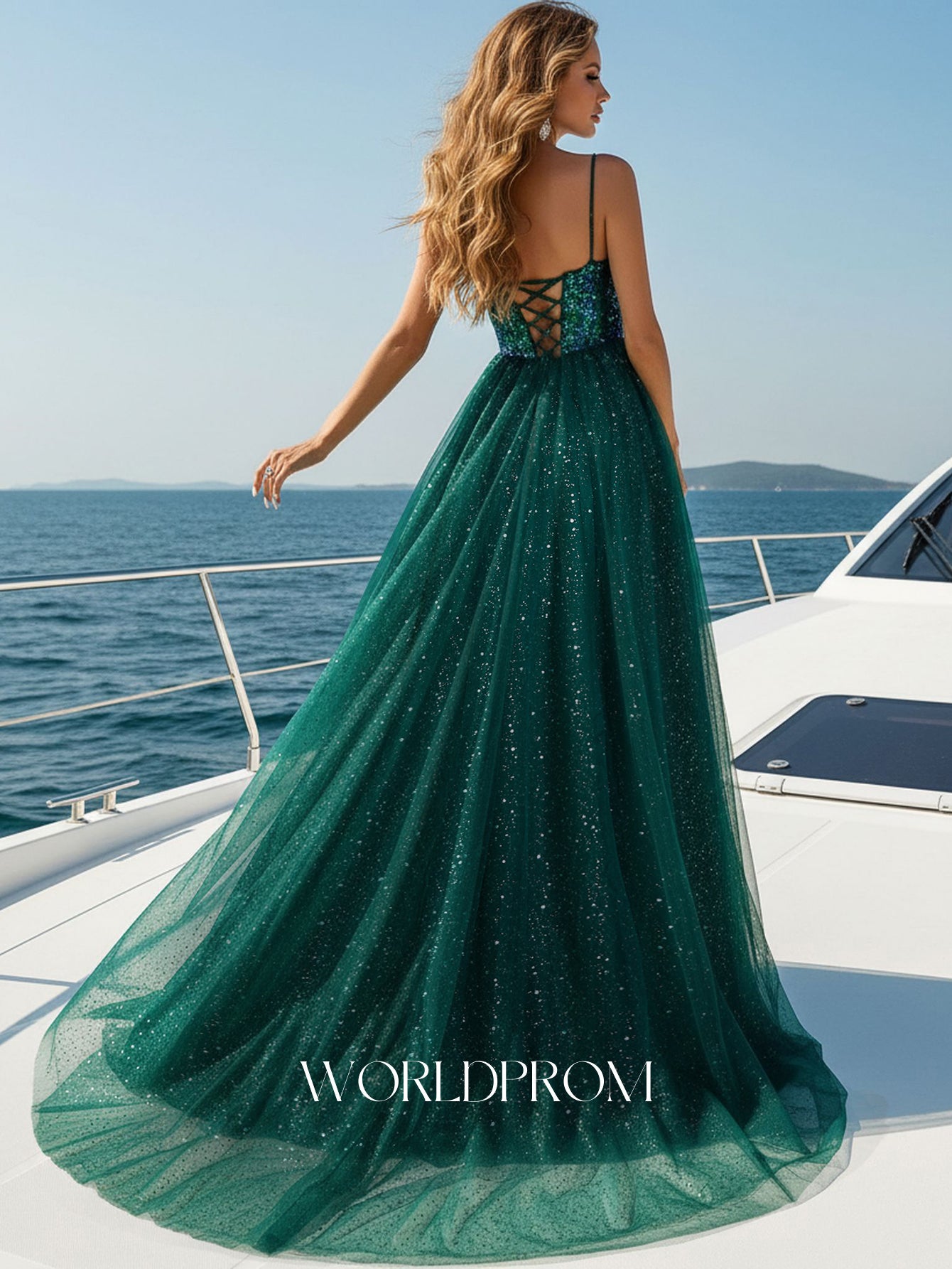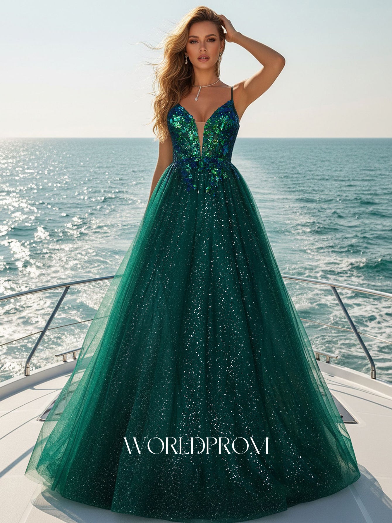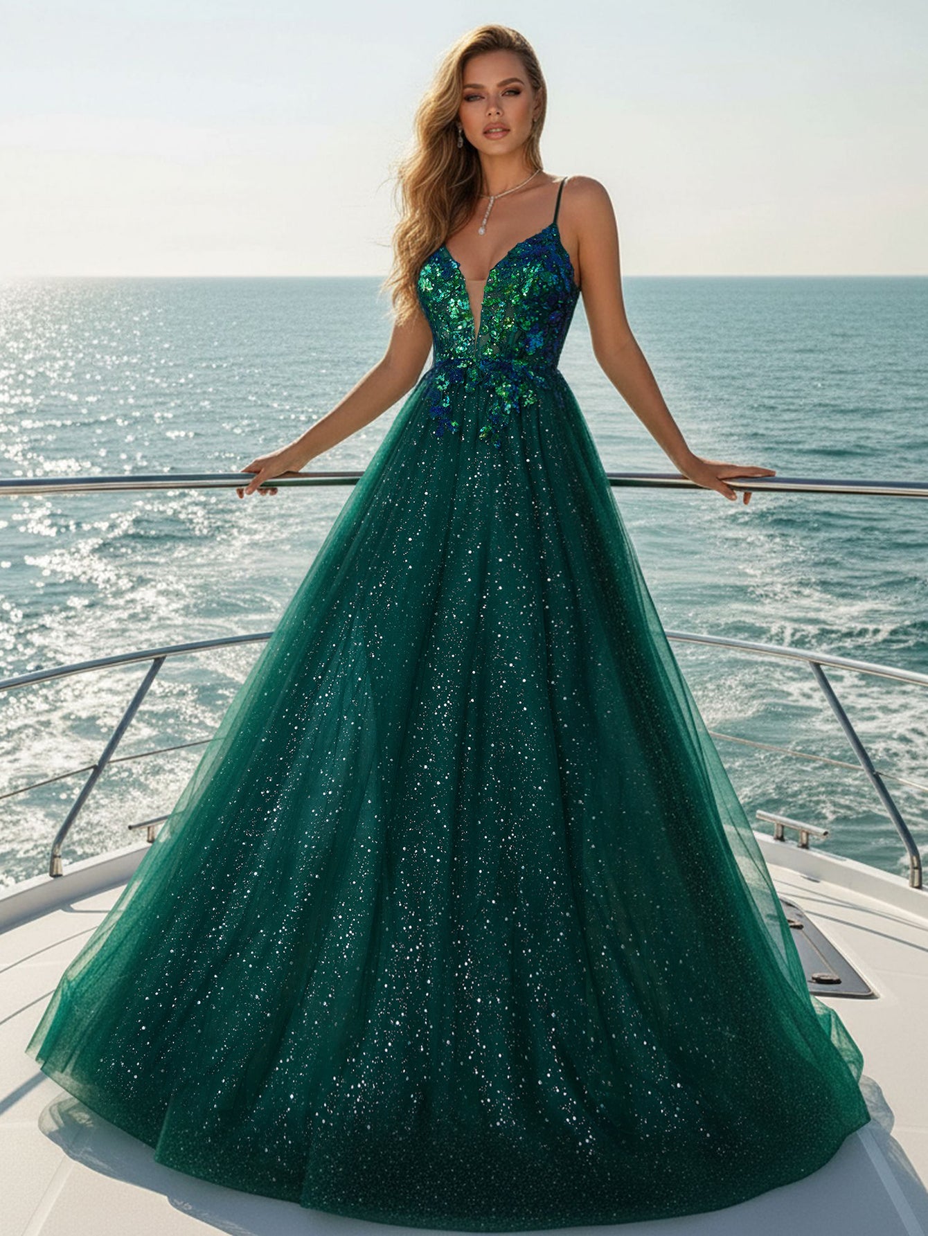 This tulle ball gown features sparkly lace on the bodice. The evening gown has a deep v-neck and pleated hem. This elegant party dress is ideal for party, evening or festivals.