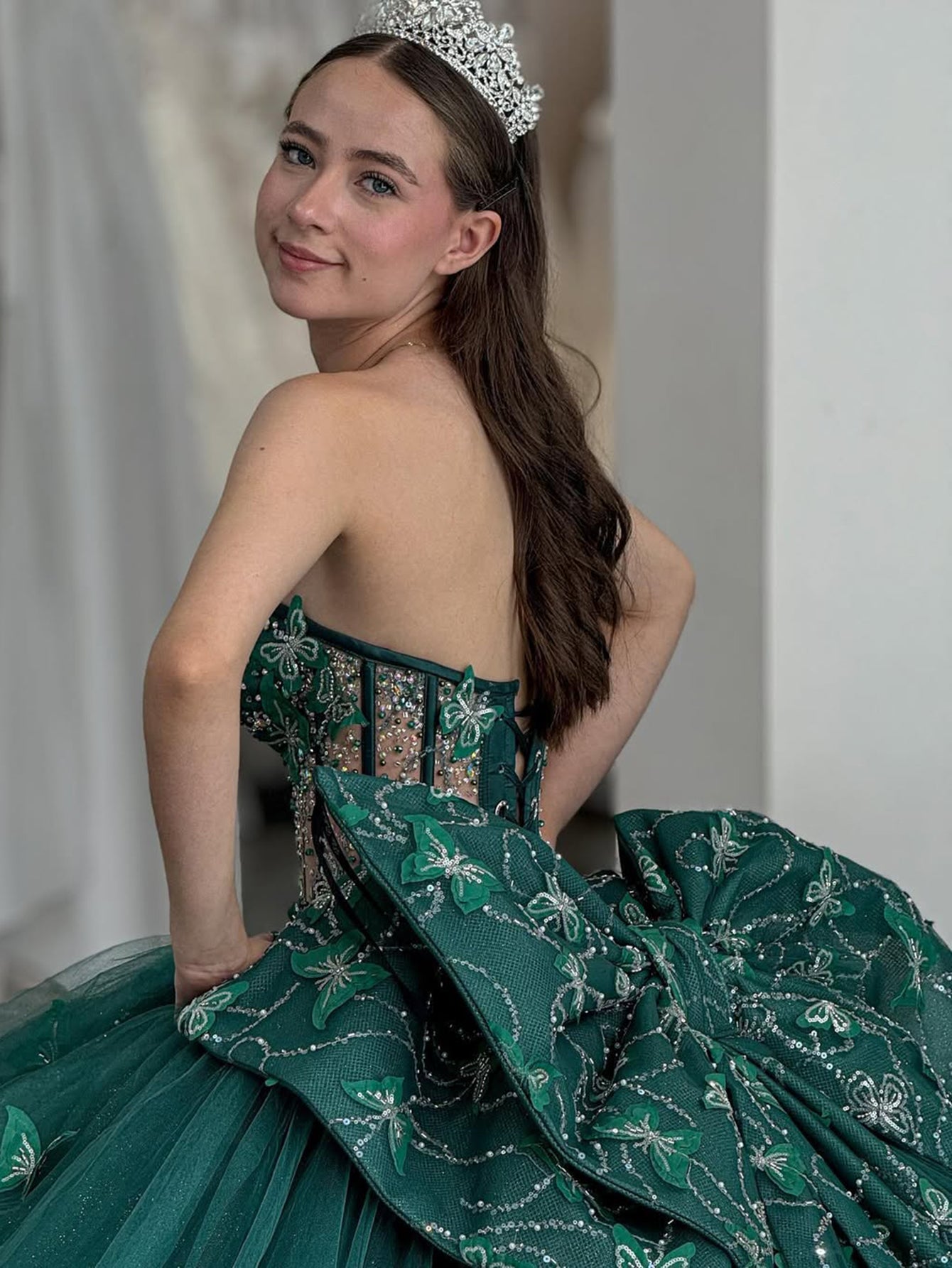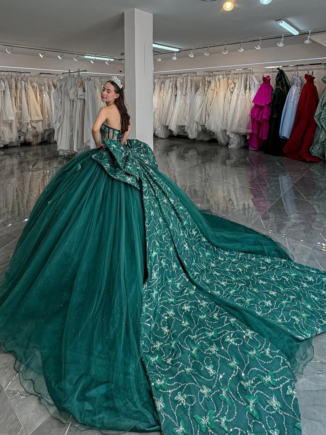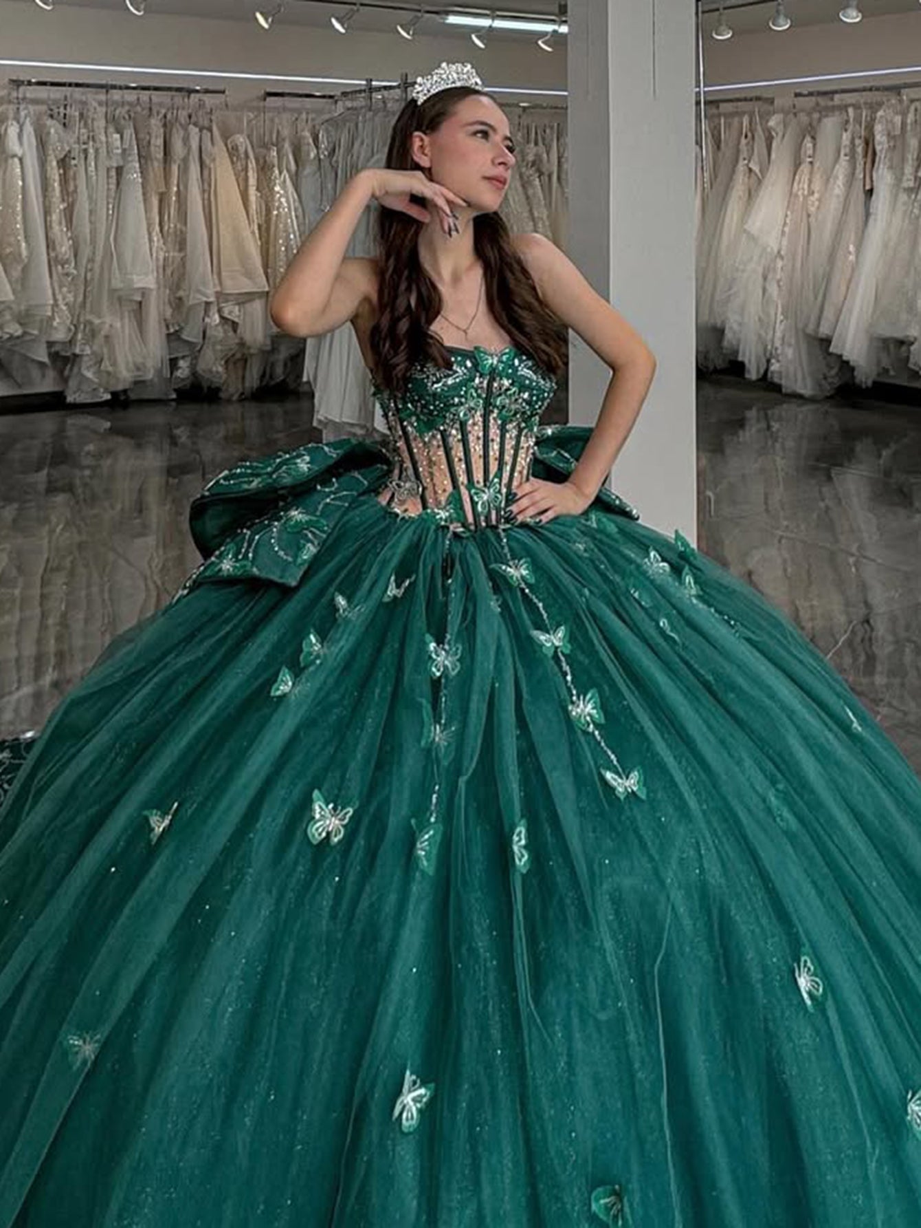 Beading Strapless Sheer Long Quinceanera Dress With Bow Back - Green