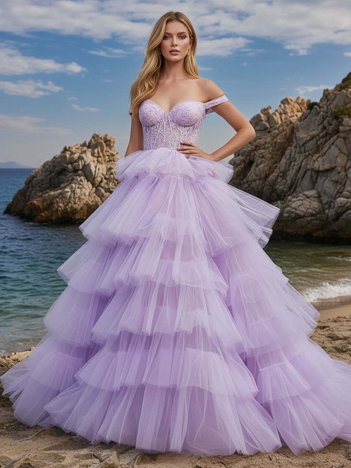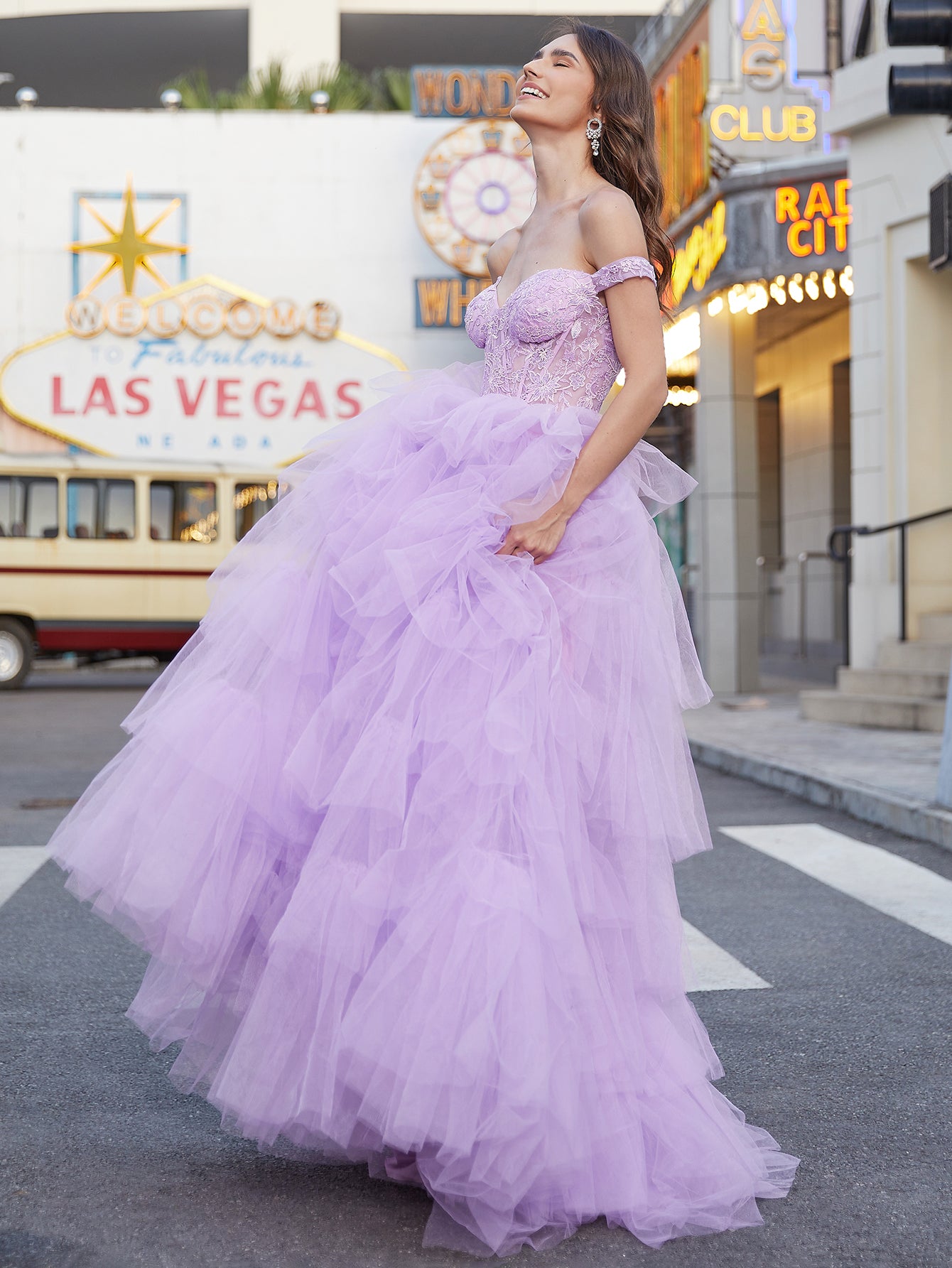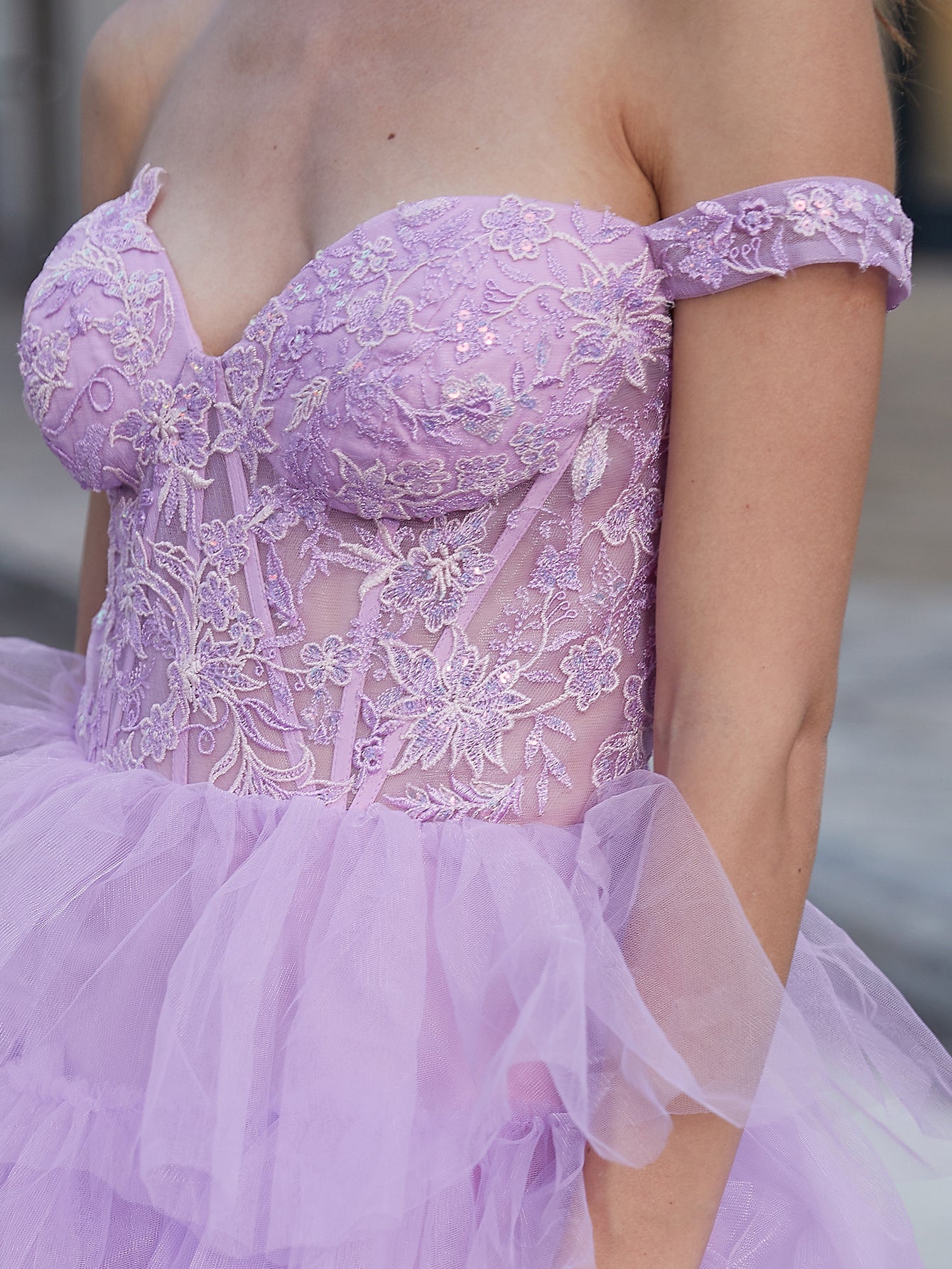 This tulle prom gown features embroidery and appliques on a sheer net bodice. The off shoulder dress for prom has a sweetheart neckline and layered ruffle hem. This lilac ball gown prom dress is ideal for party, evening, anniversary party, birthday party, cocktail, graduation party or homecoming events.