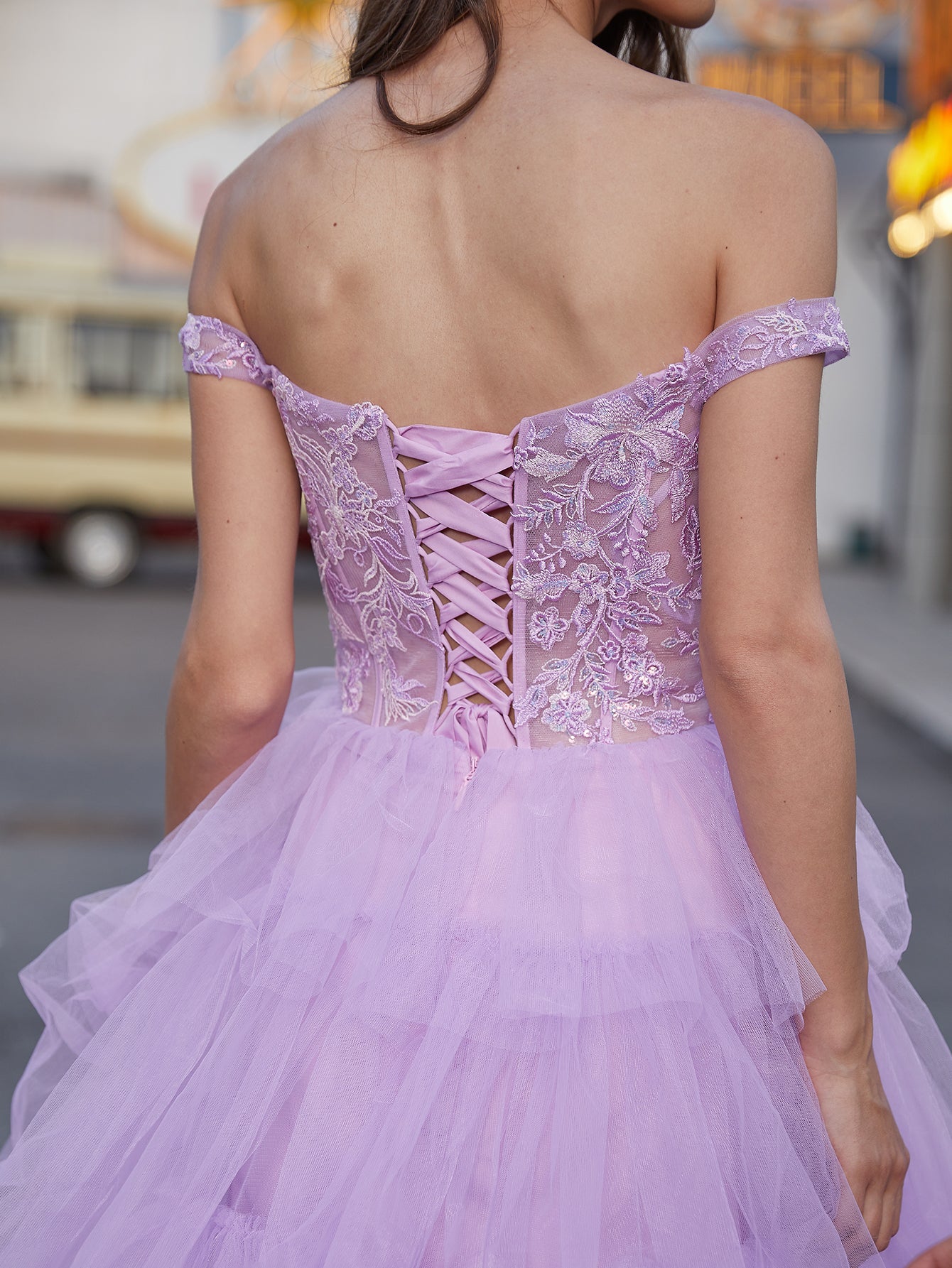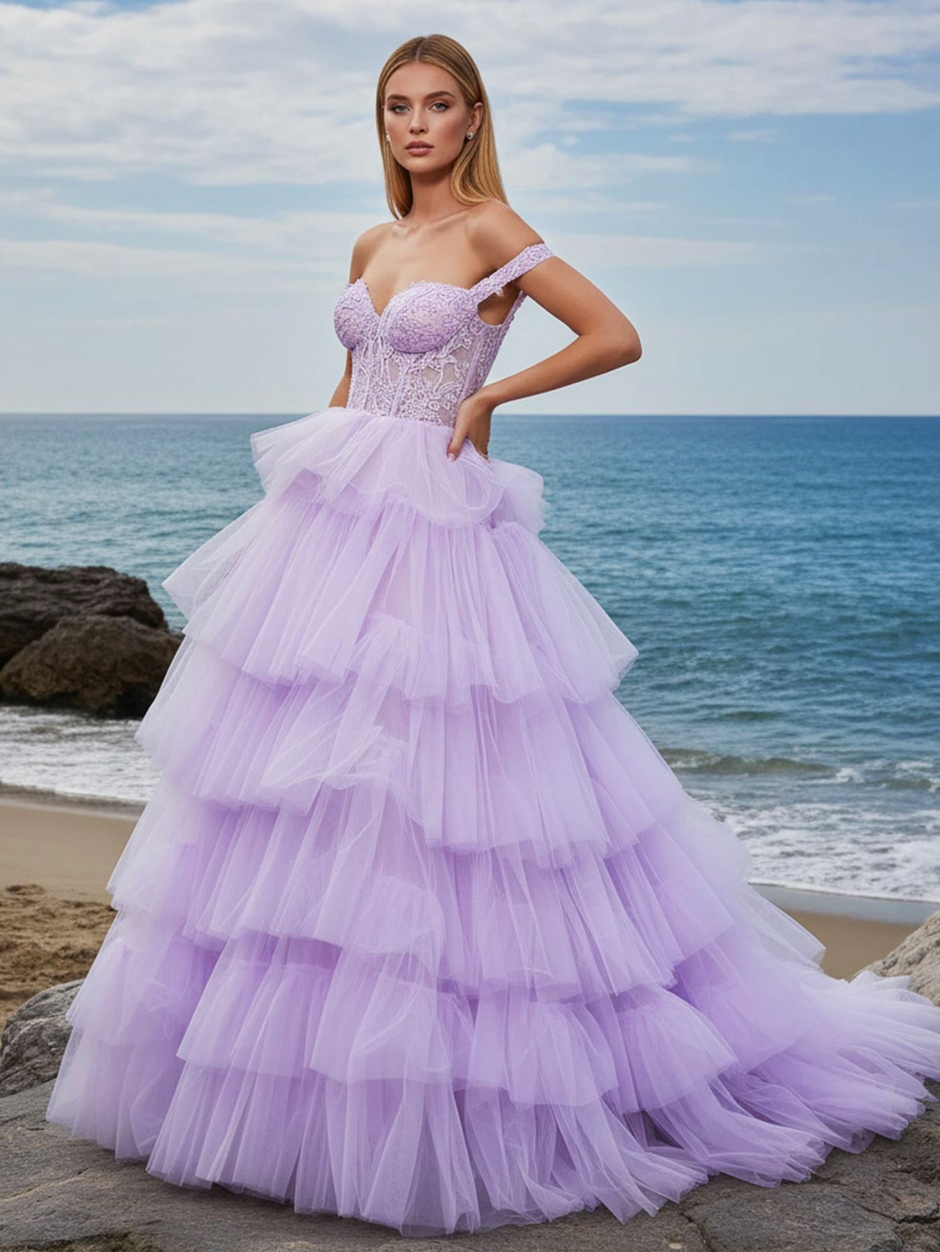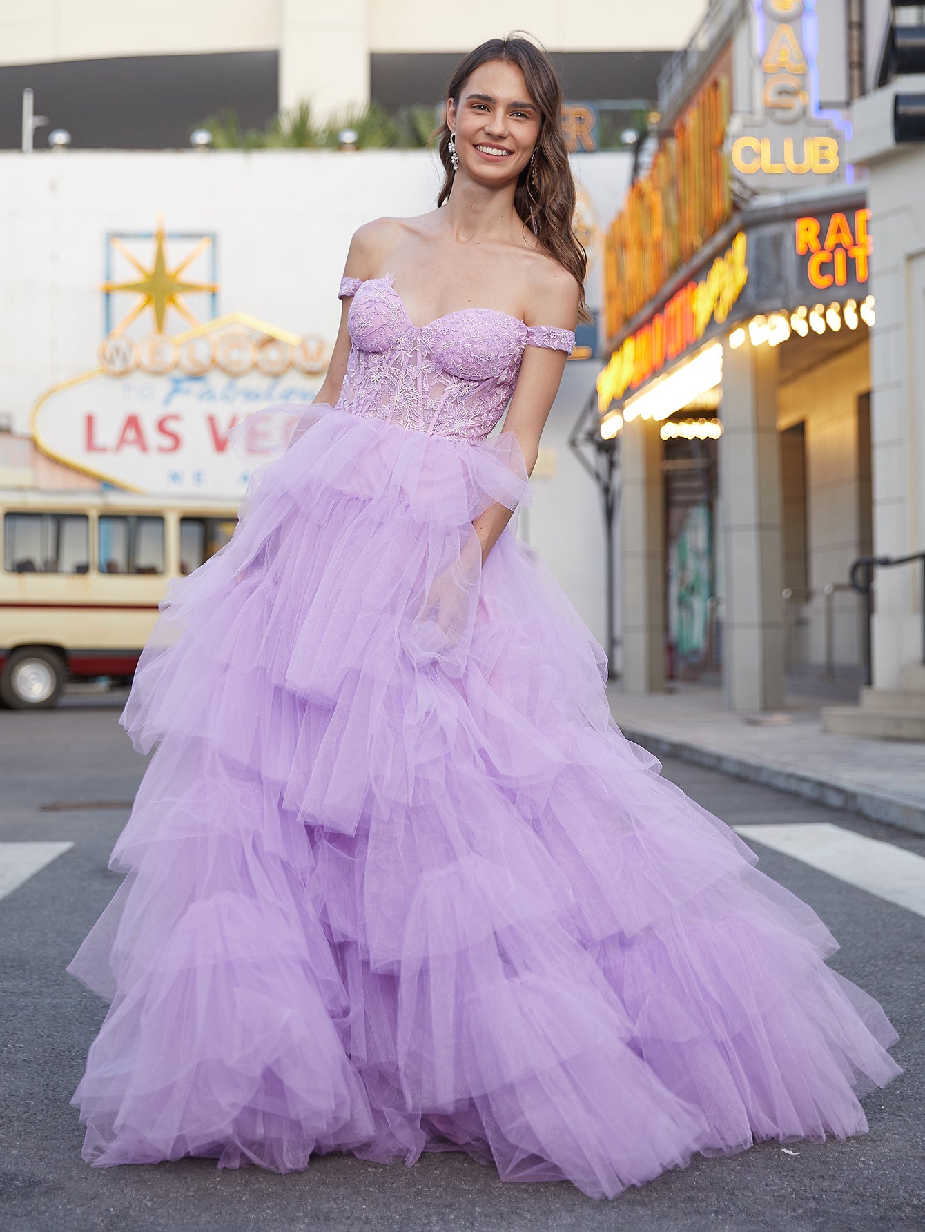 This tulle prom gown features embroidery and appliques on a sheer net bodice. The off shoulder dress for prom has a sweetheart neckline and layered ruffle hem. This lilac ball gown prom dress is ideal for party, evening, anniversary party, birthday party, cocktail, graduation party or homecoming events.