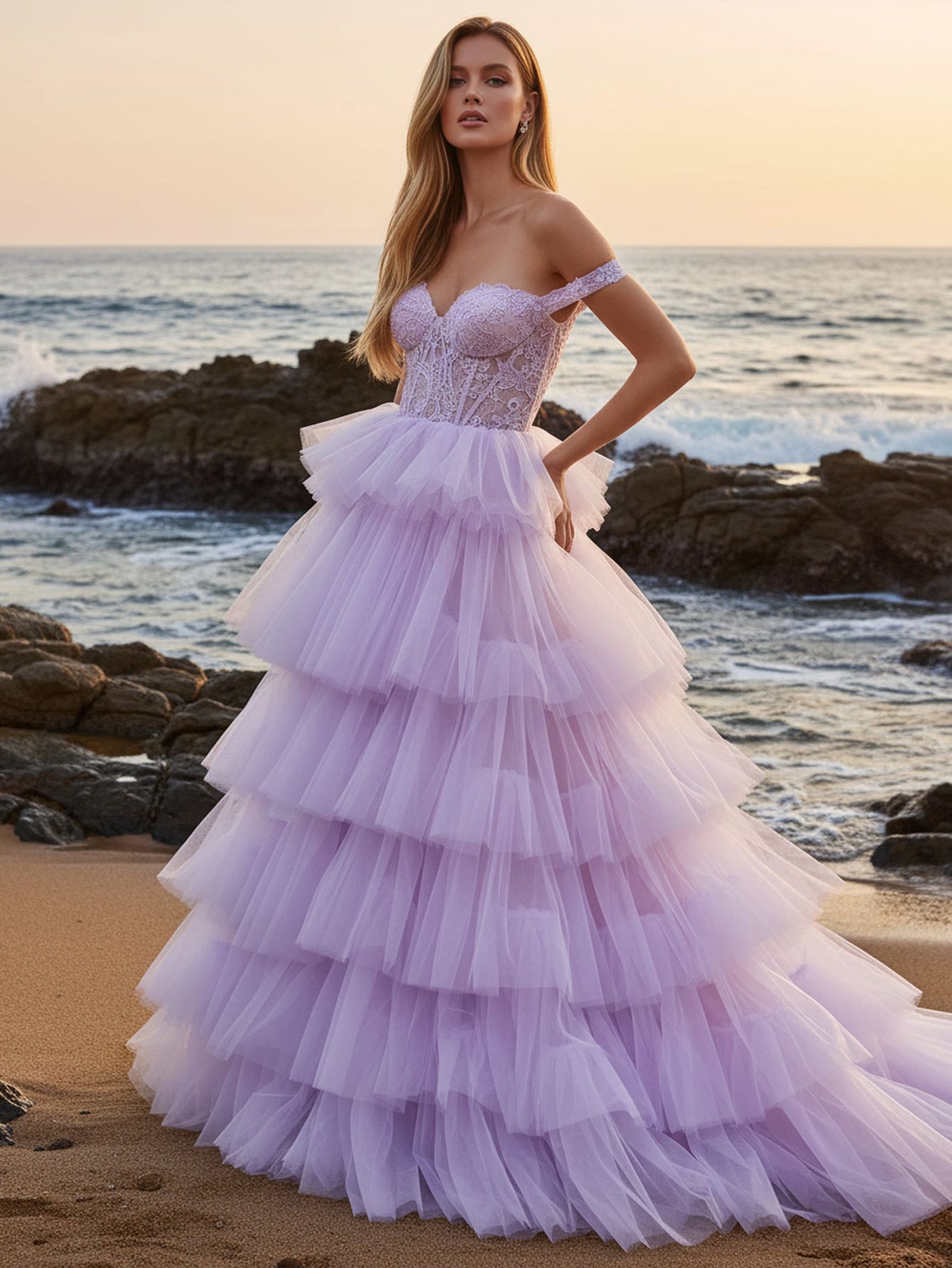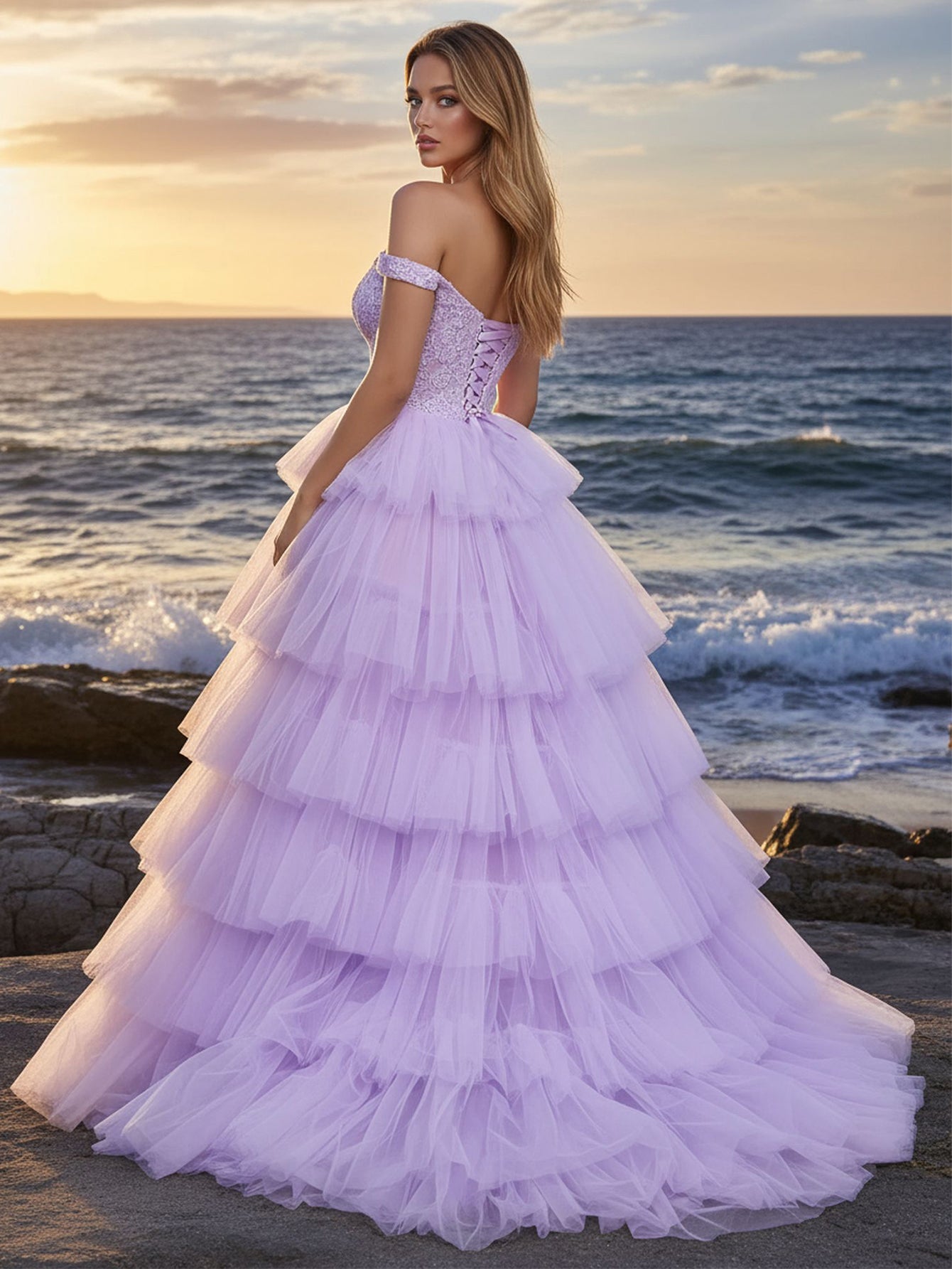 Off Shoulder Ruffled Tiered Lace Embroidery Tulle Ball Gown Prom Dress - Lilac