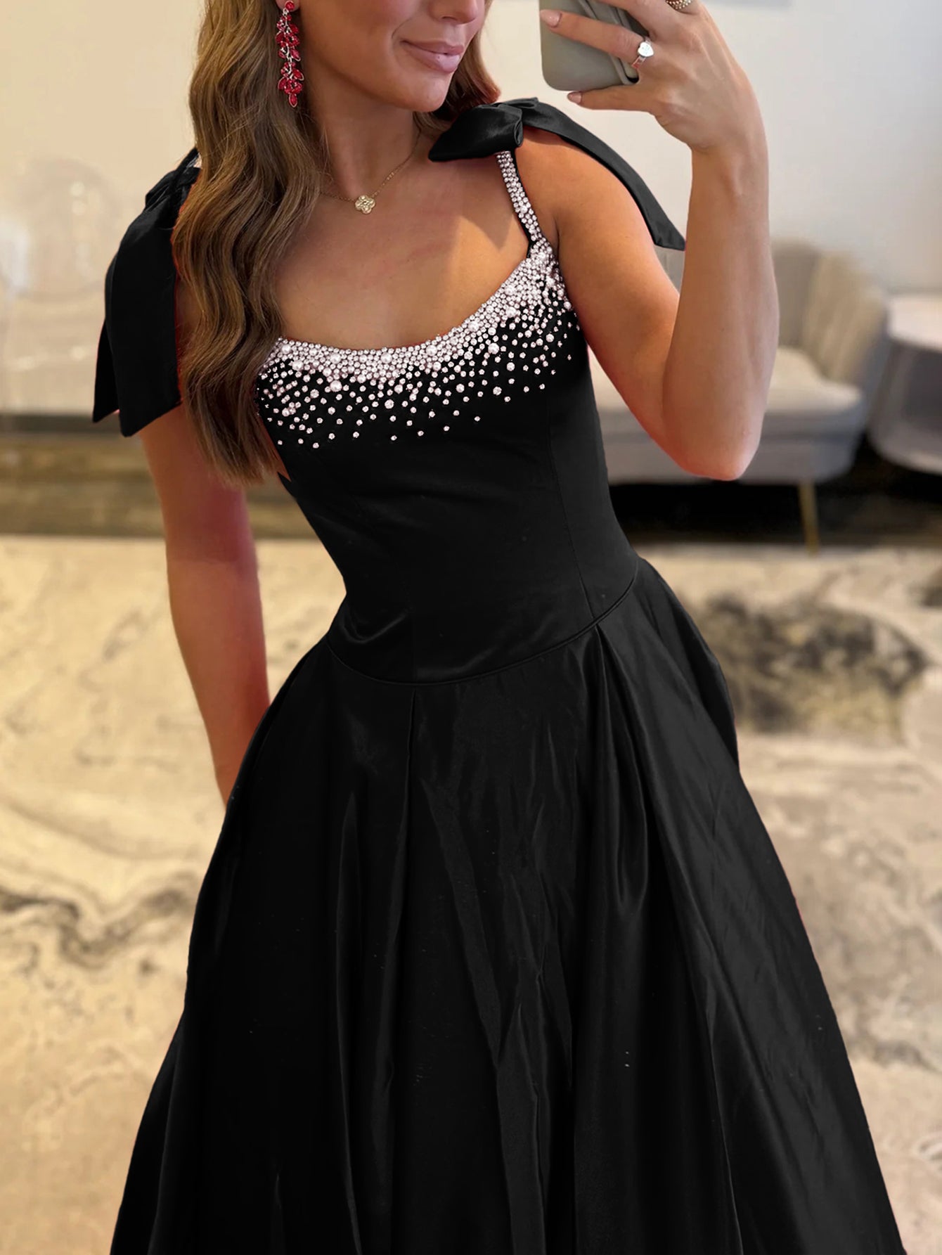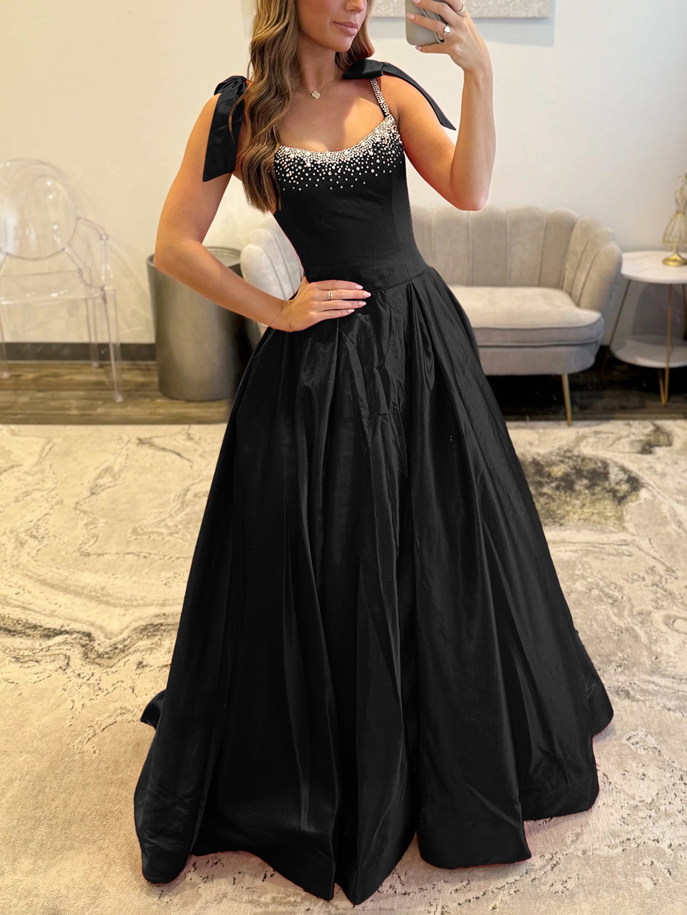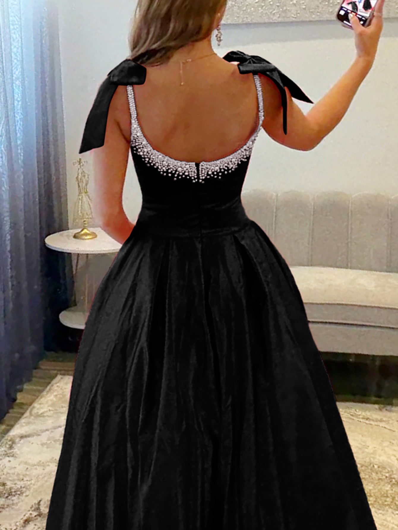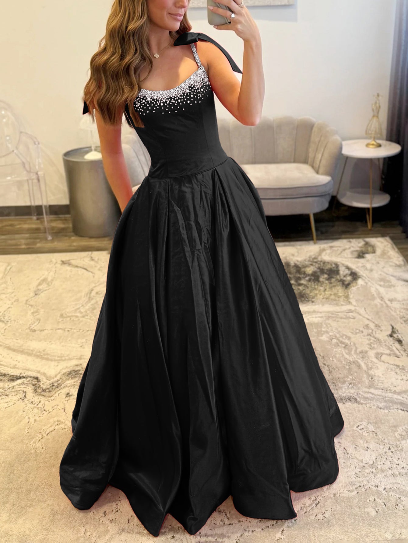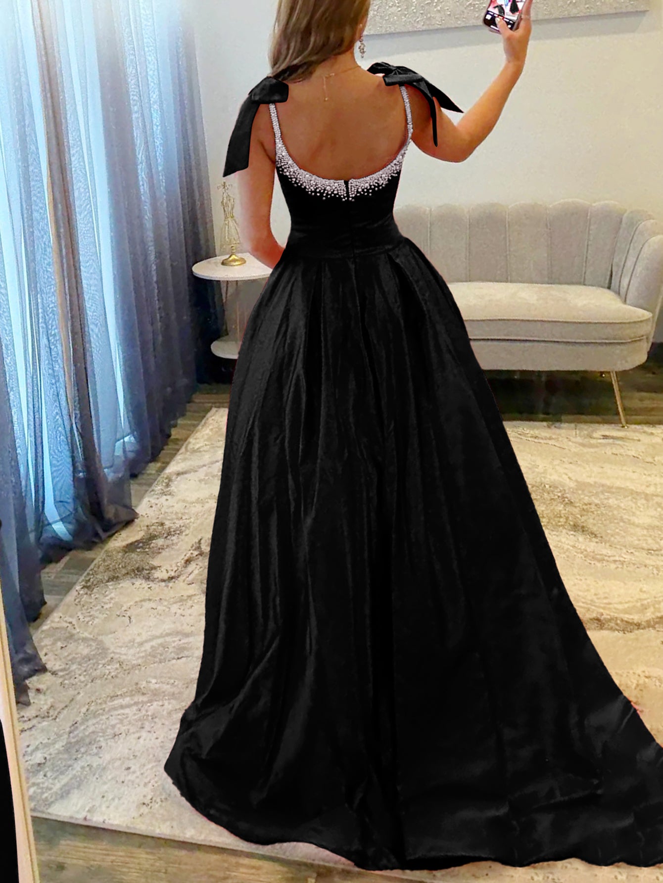 This satin prom gown features hand-beading with bows on the bodice. The long evening dress has a scoop neckline and ball gown hem. This formal dress is ideal for party, evening or festivals.
