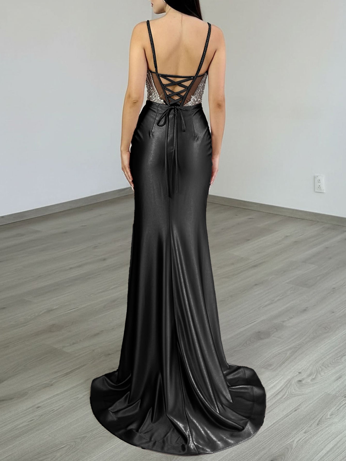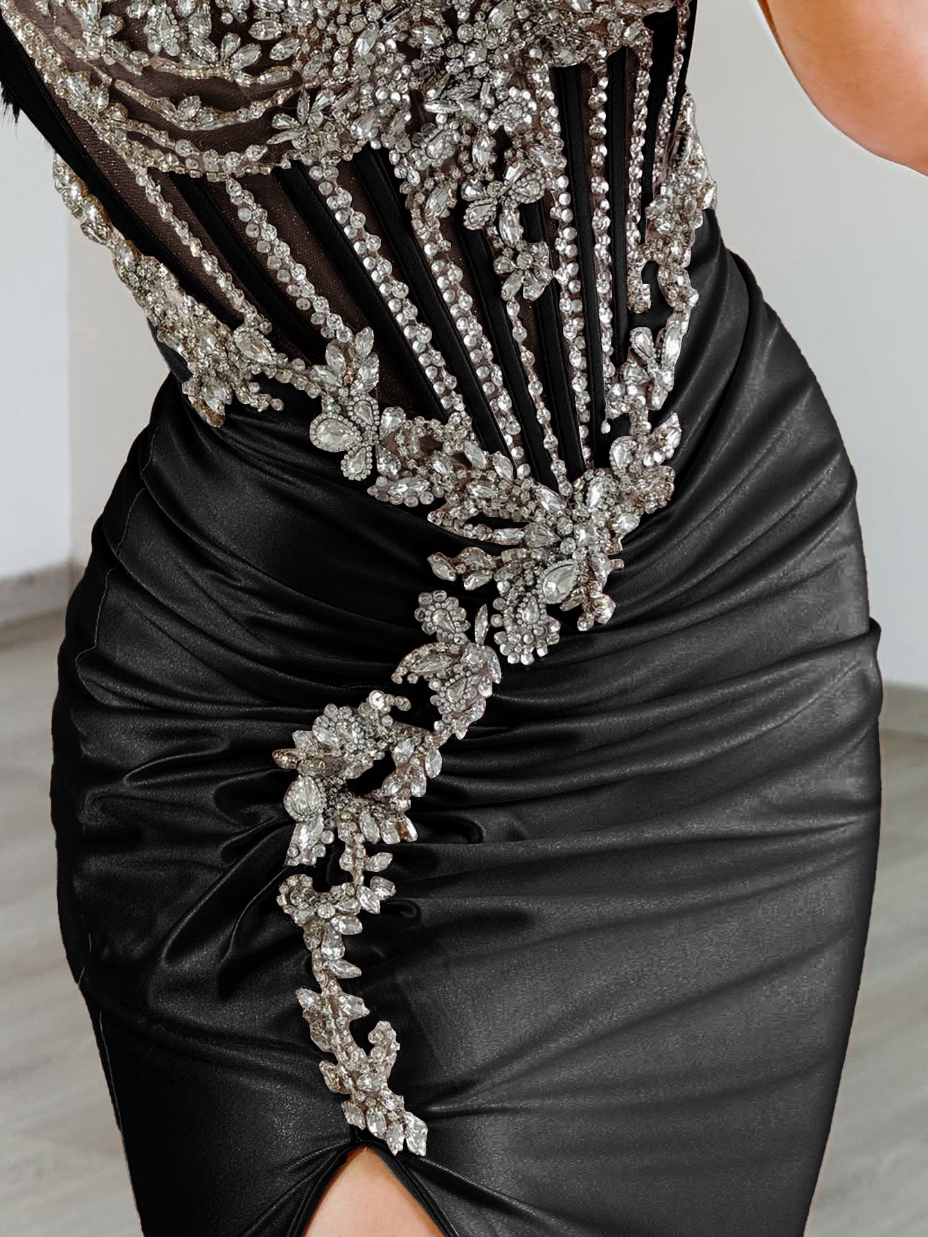 This stretch satin evening dress features ruched waist with crystals on the illusion bodice. The strapless boned maxi dress has a V-neck and split hem. Luxury mermaid dresses are ideal for party, evening or festivals.