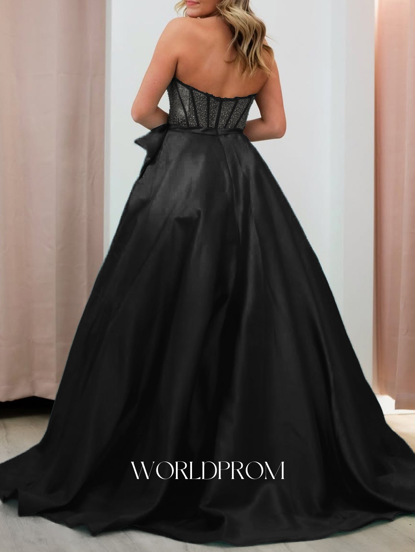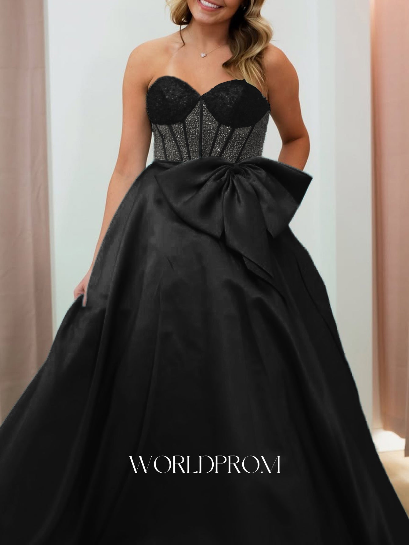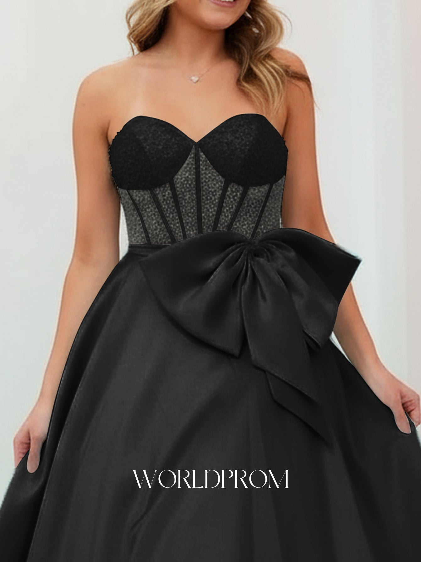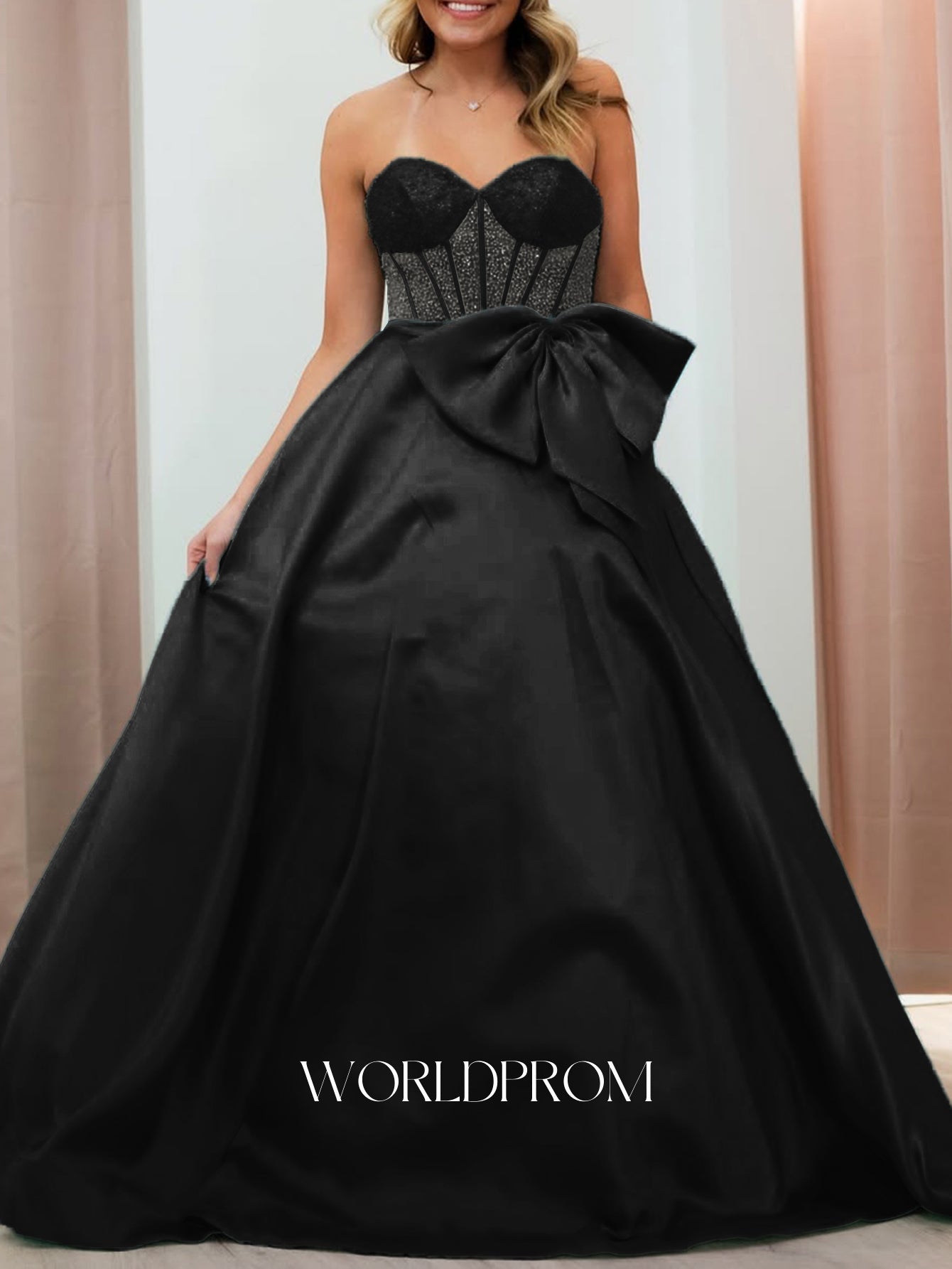 This satin prom gown features big bow with sheer on the illusion bodice. The strapless dress has a sweetheart neckline and pleated hem. Worldprom ball gown prom dresses are ideal for party, evening or festivals.