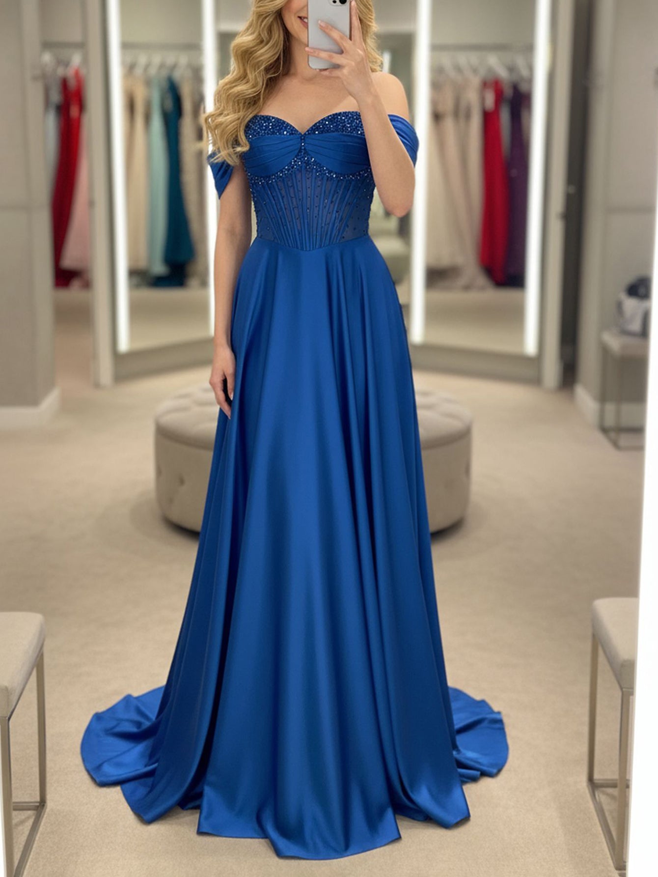 This satin prom gown features crystal beading sheer on the illusion bodice. The evening dress has a sweetheart neckline and pleated hem. Worldprom mermaid prom dresses are ideal for party, evening or festivals.