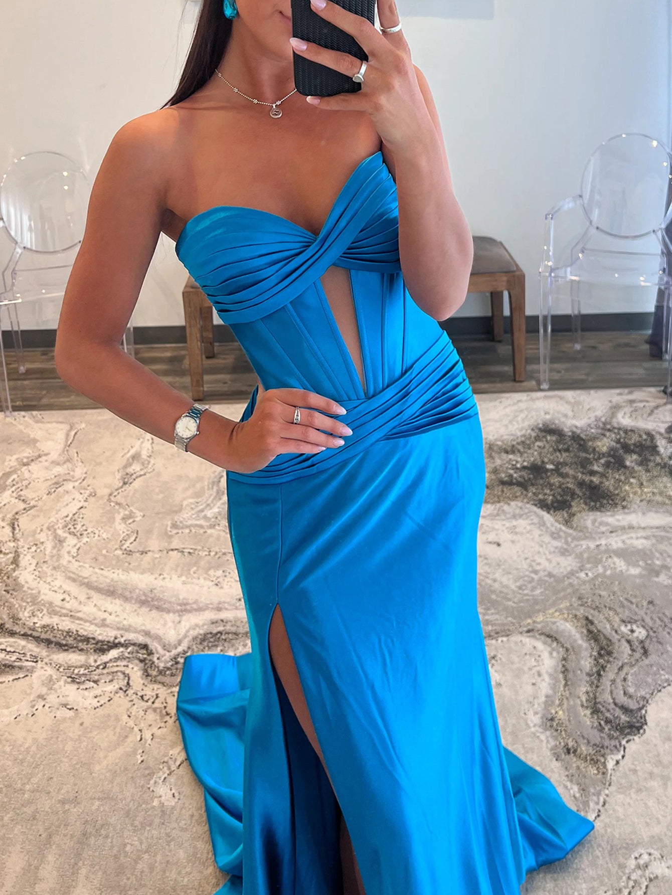 This stretch satin prom gown features cut front on the bodice. The strapless maxi dress has a sweetheart neckline and pleated hem. This mermaid formal dress is ideal for party, evening or festivals.
