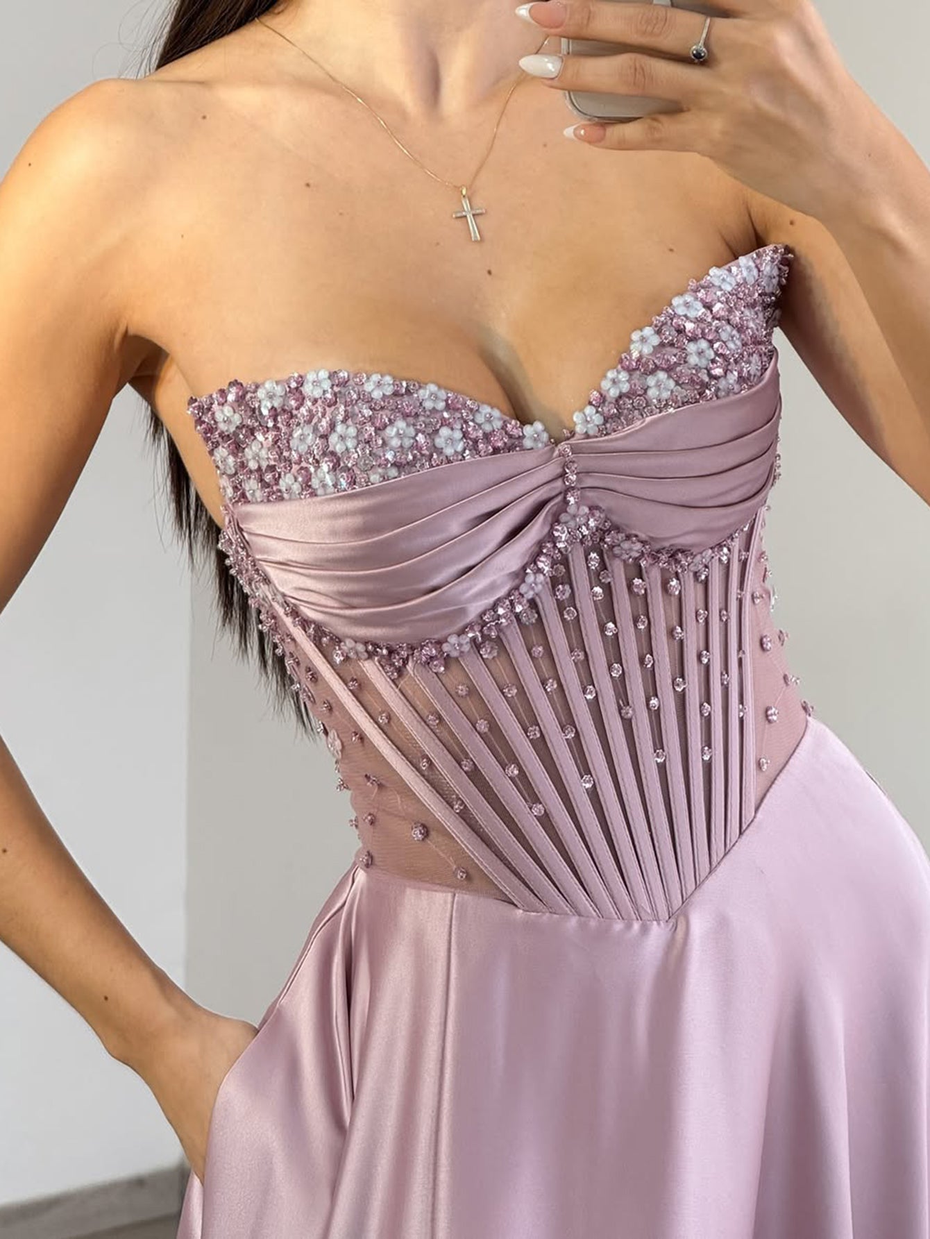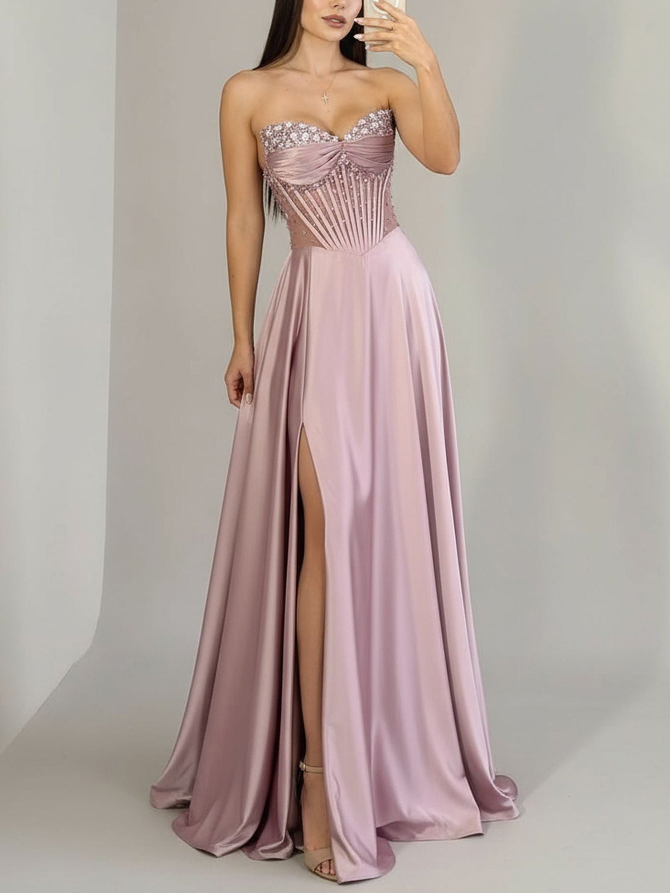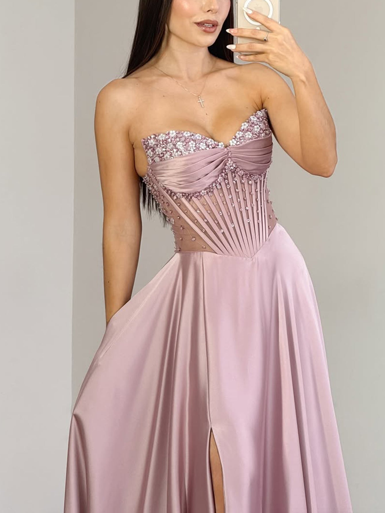 This satin prom gown features crystal beading sheer on the illusion bodice. The evening dress has a sweetheart neckline and pleated hem. Worldprom mermaid prom dresses are ideal for party, evening or festivals.