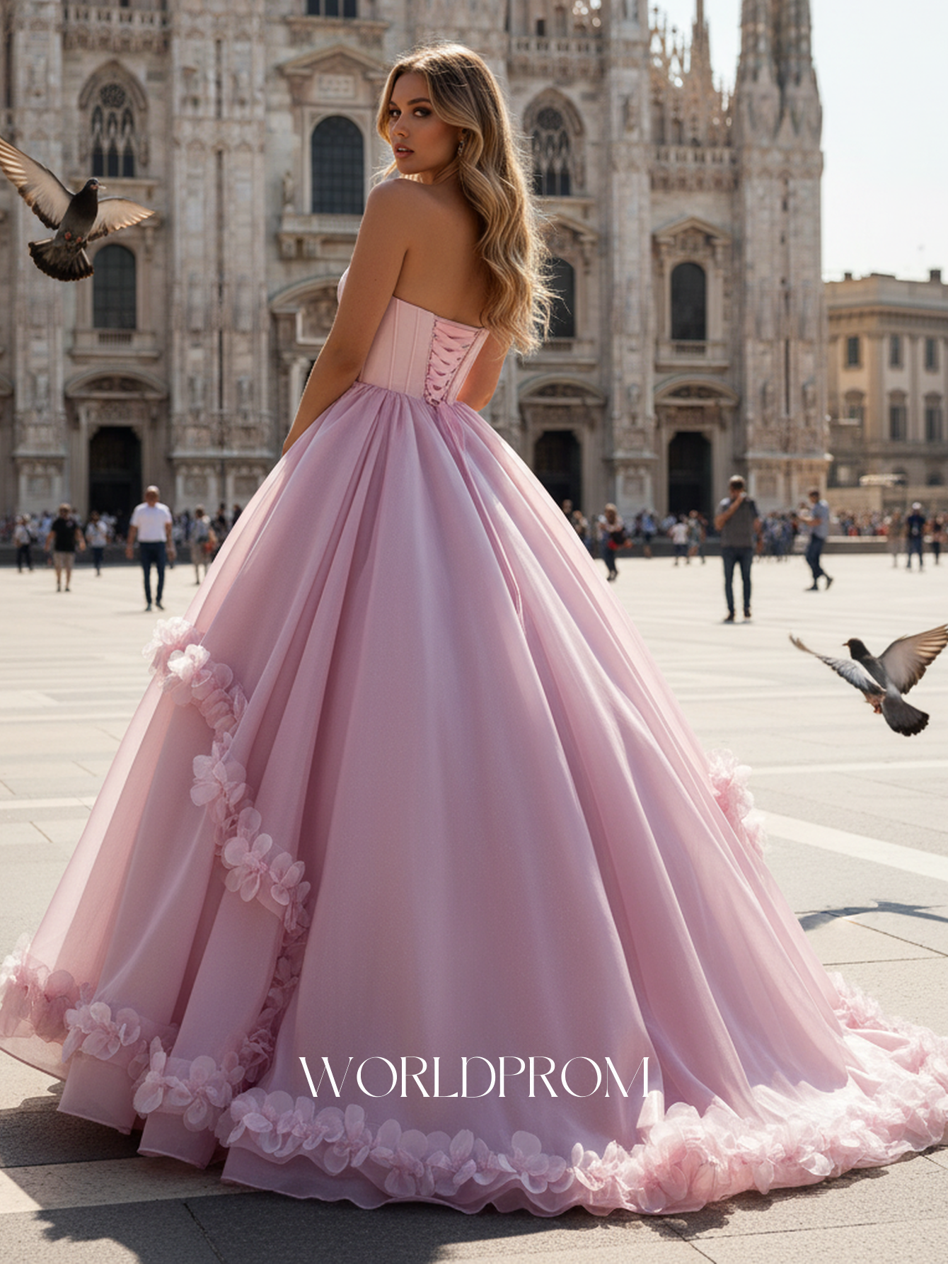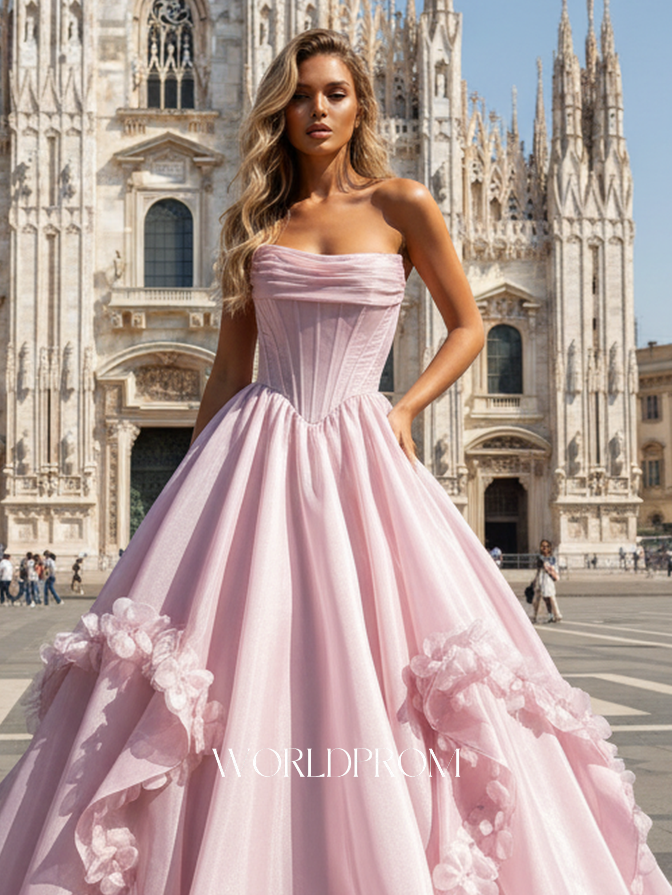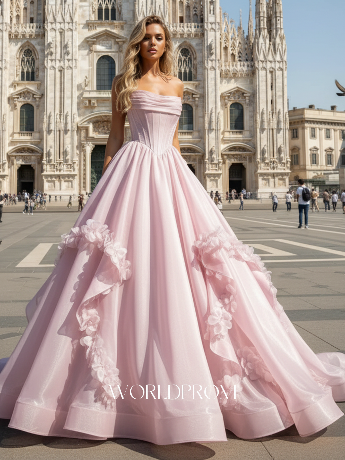 This organza prom gown features ruched waist on the bodice. The strapless dress has a scoop neck and pleated hem with 3d flowers. Worldprom ball gown prom dresses are ideal for party, evening or festivals.