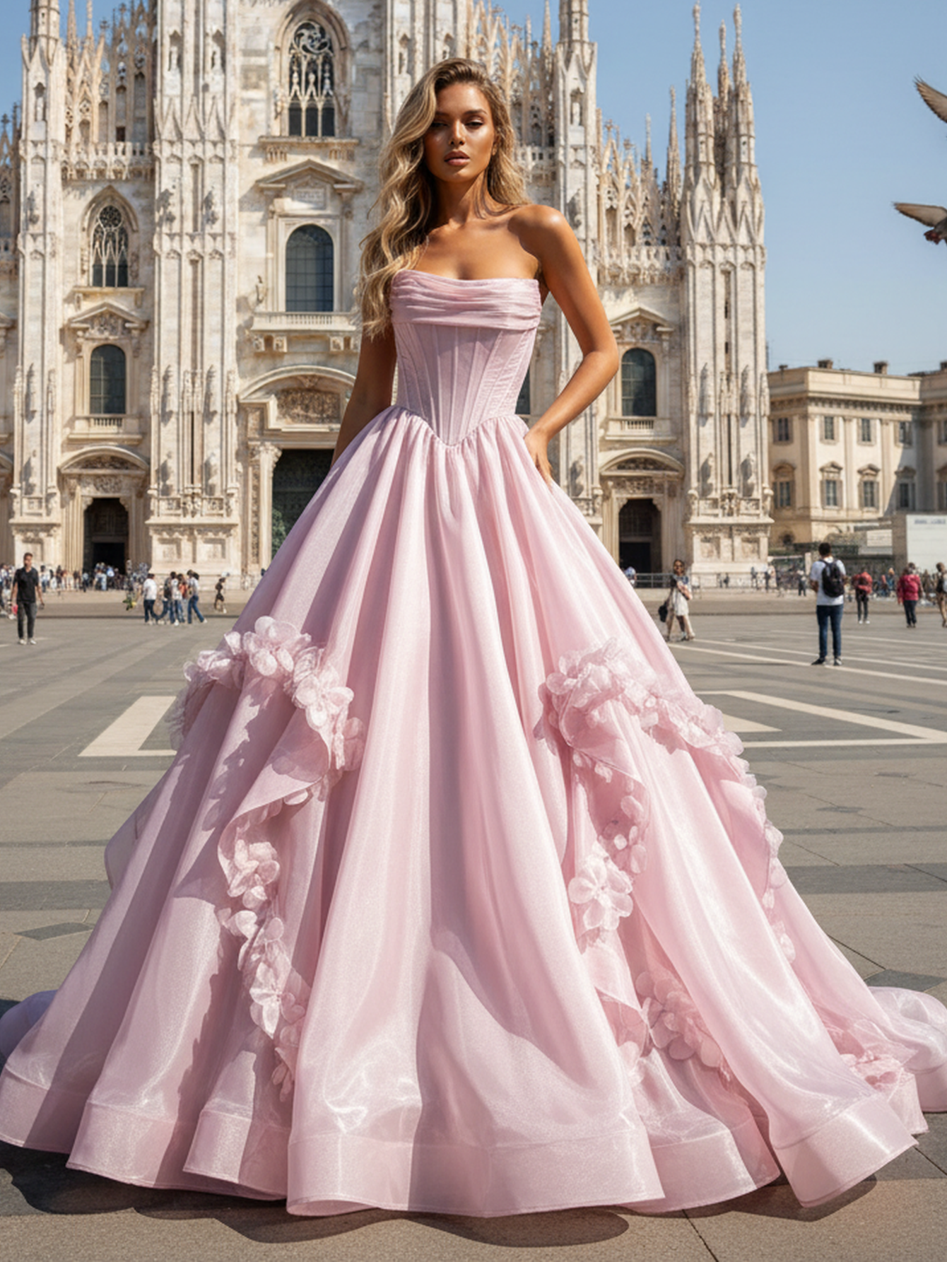 Strapless 3D Flowers Ruched Bust Pleated Long Ball Gown Prom Dress - Blush Pink