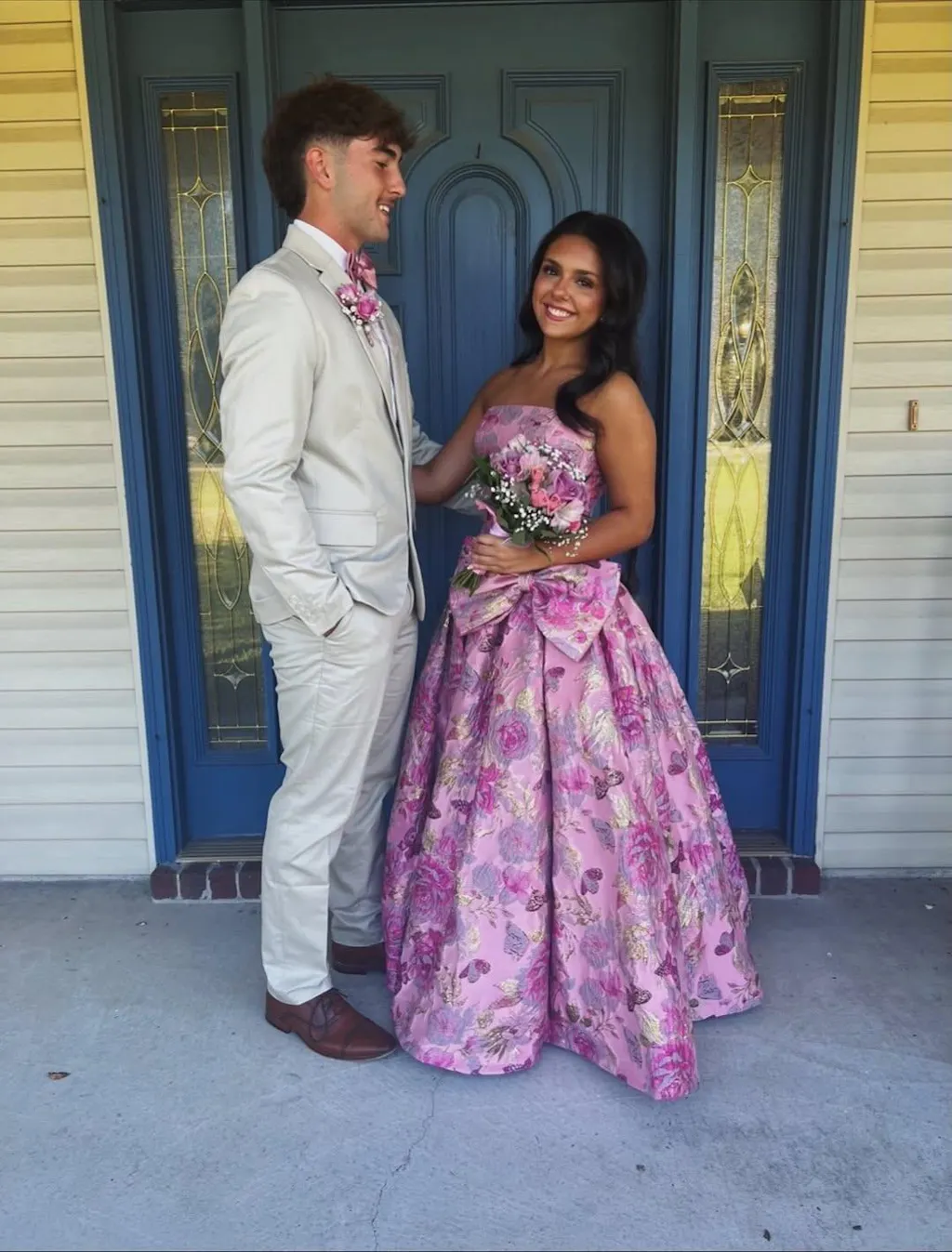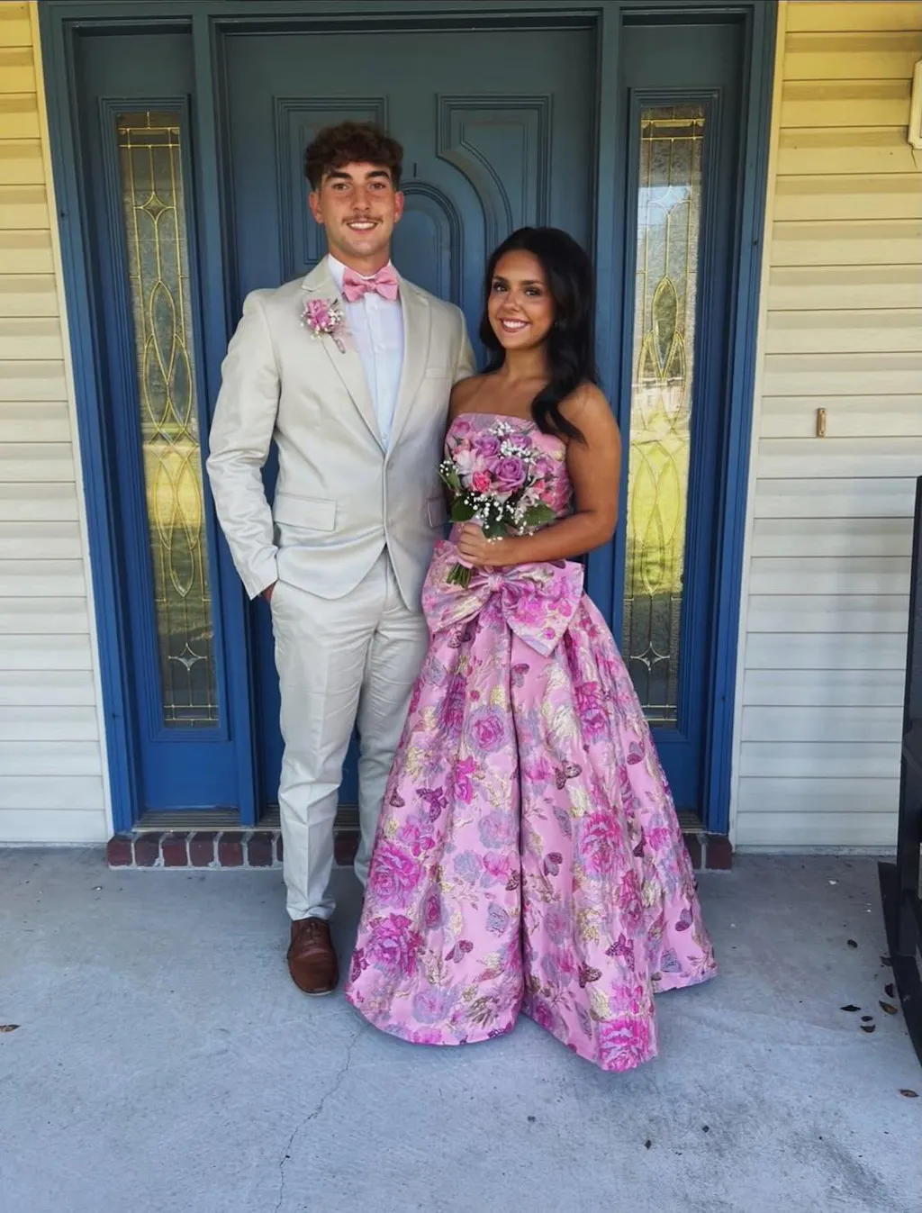Big Bow Flower Embroidery Mermaid Prom Dress With Split in Pink Floral