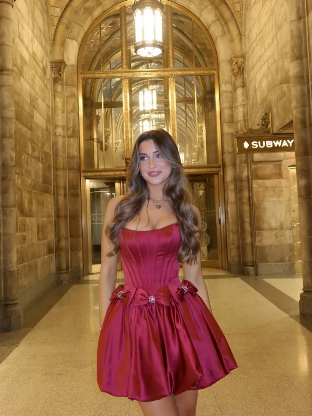 This chiffon mini dress features boned with waist bow on the bodice. The ball gown hoco dress has a scoop neck and tiered hem. The short prom puffy dress is ideal for graduation party, homecoming or prom party.