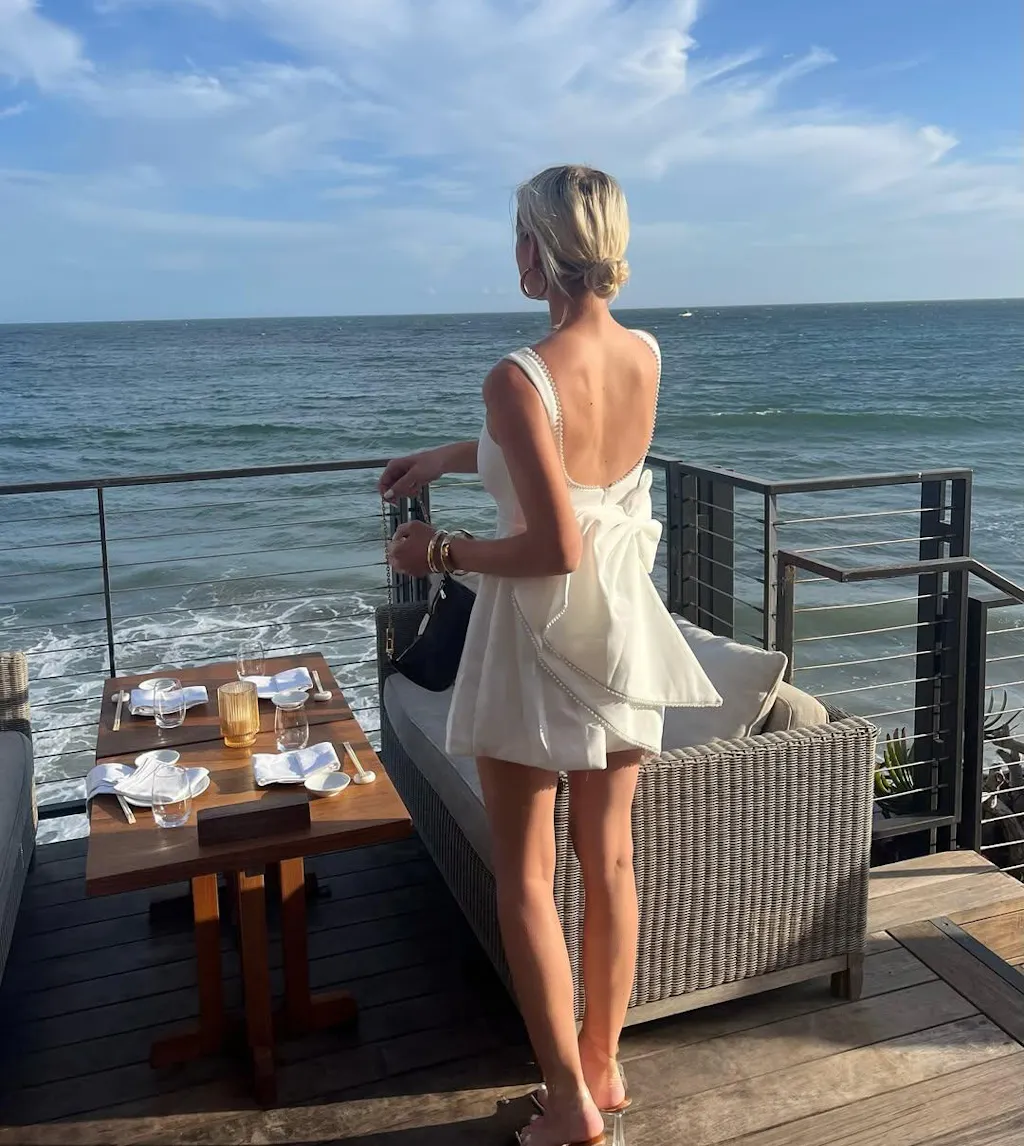Details: Backless, Fitted Waist, Hand Beading, With Bow