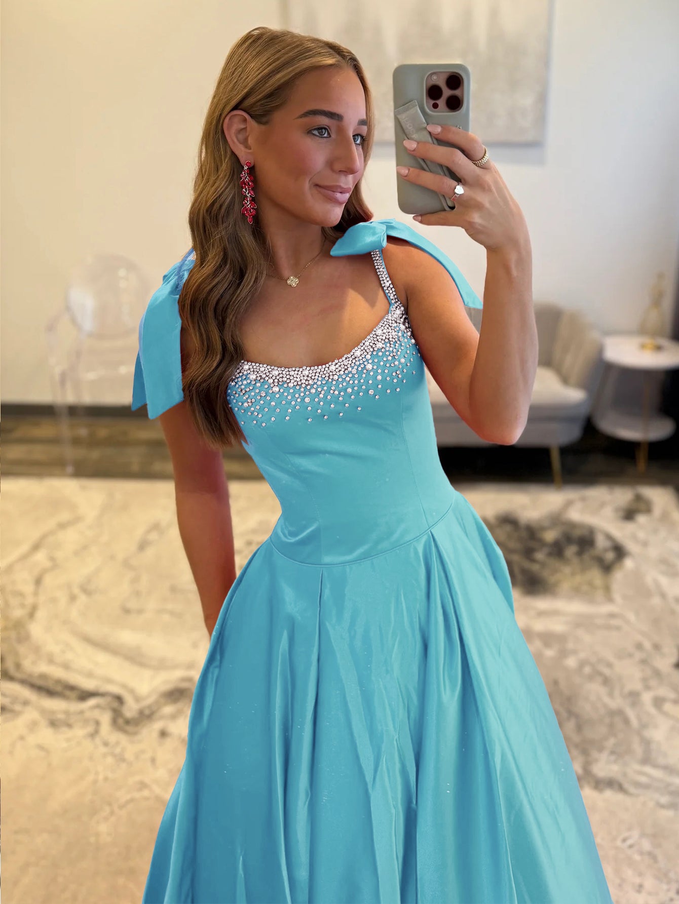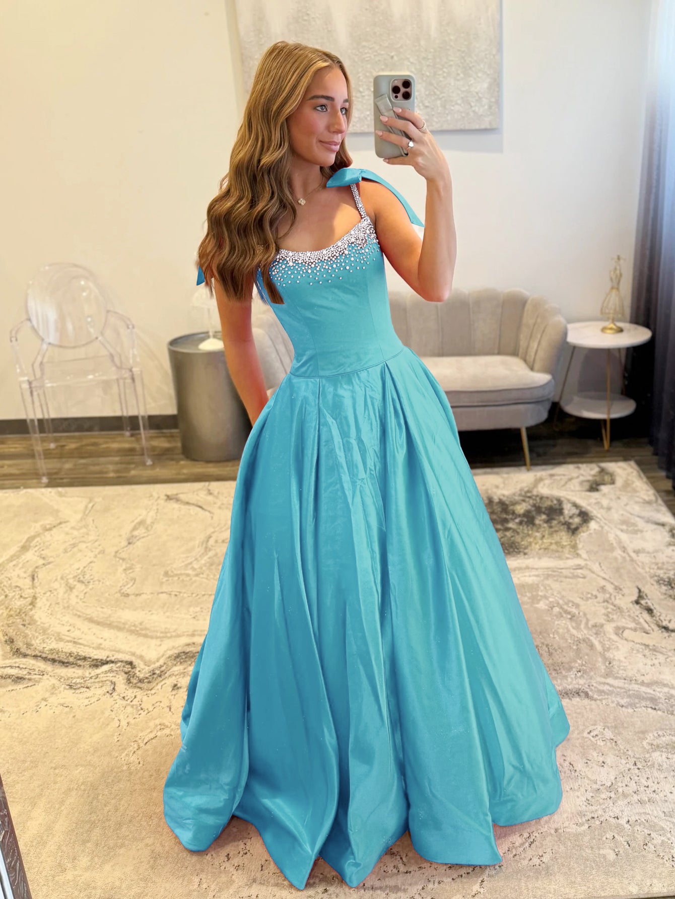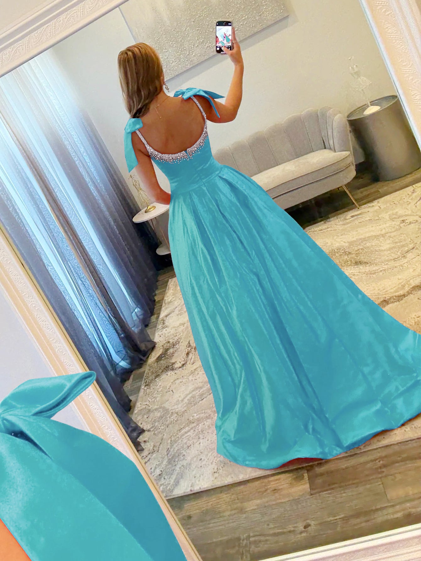 Hand Beading Bodice Ball Gown Prom Dress With Bows - Aqua Blue