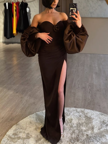 3D Flower Lace Up Sweetheart Bodice Mermaid Prom Dress With Removable Puffy Sleeves - Brown