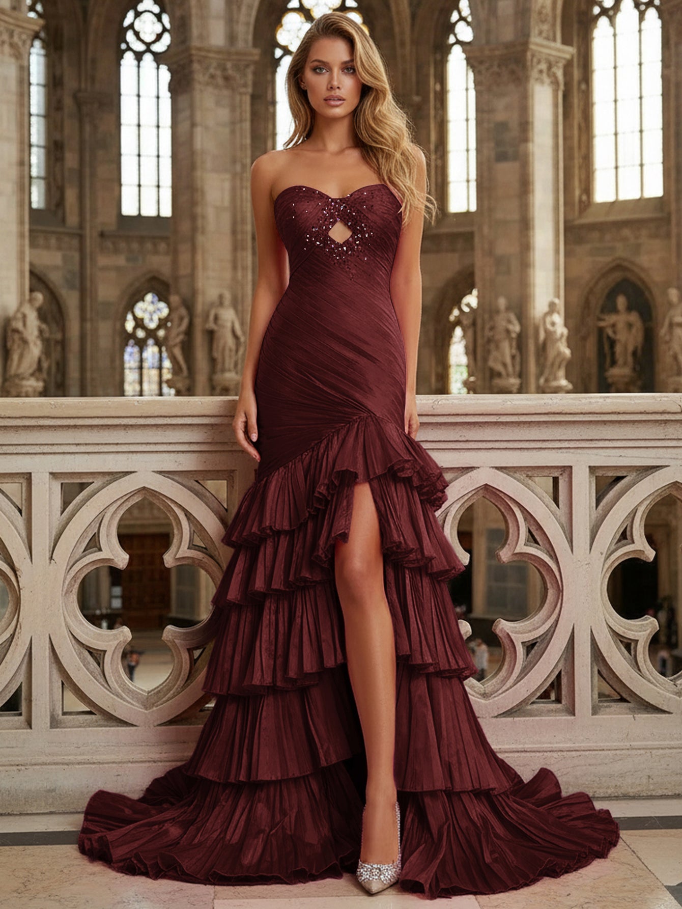 Details: Sparkly, Beading, Cut Front, Bow Back, Ruffled, Ruched, Pleated