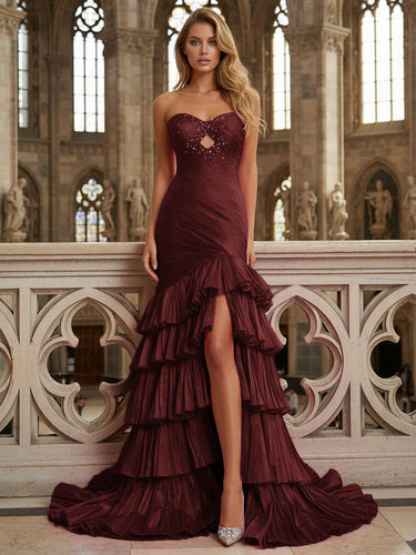Cut Front Sparkly Beading Bow Back Ruched Bodice Mermaid Long Prom Dress With Slit - Burgundy
