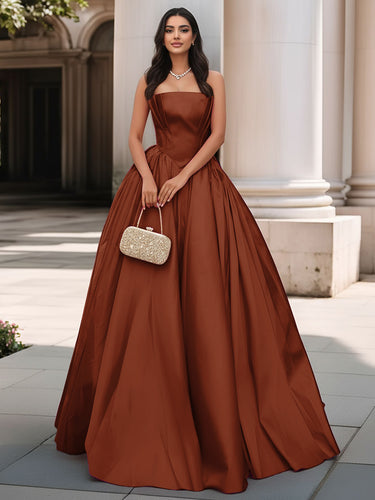 Pleated Bust Ruffle Hem Strapless Satin Prom Ball Gown - Burnt Orange