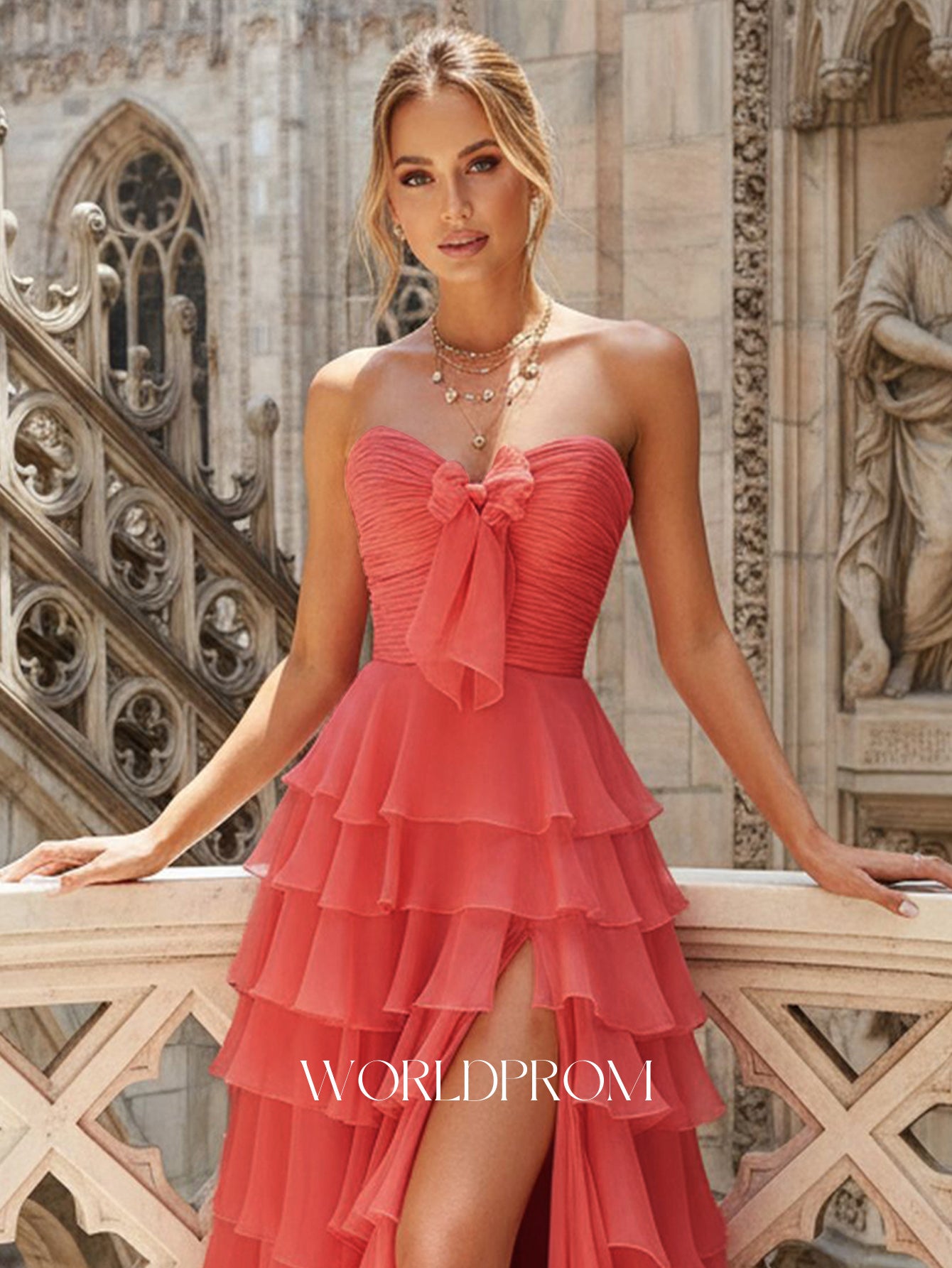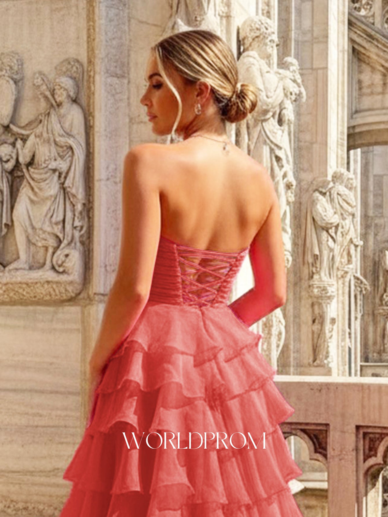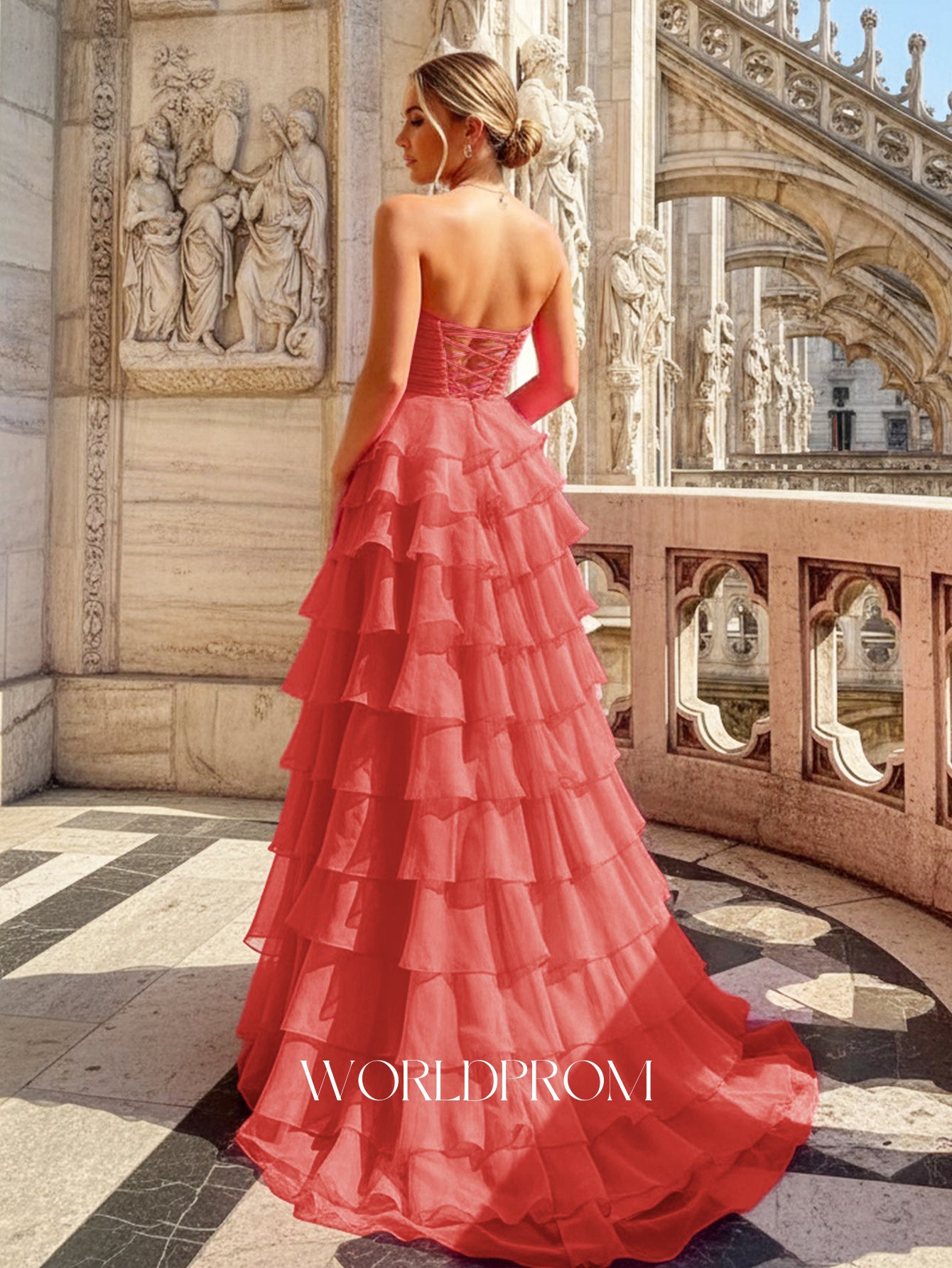 This chiffon prom gown features fitted waist on the bodice. The strapless dress has a sweetheart neck and ruffled tiered hem. This maxi formal dress ball gown is ideal for party, evening or festivals.