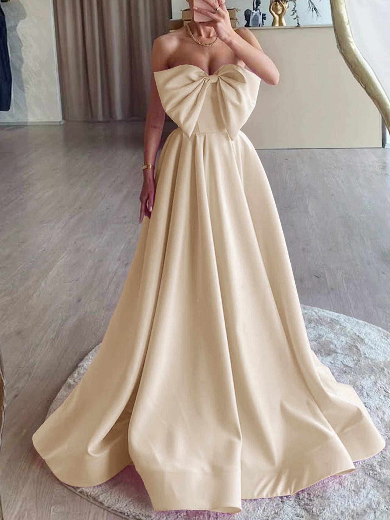 This satin prom dress features big bow on the bodice. The strapless ball gown dress has a pleated hem. Bow maxi dresses are ideal for party, evening or festivals.