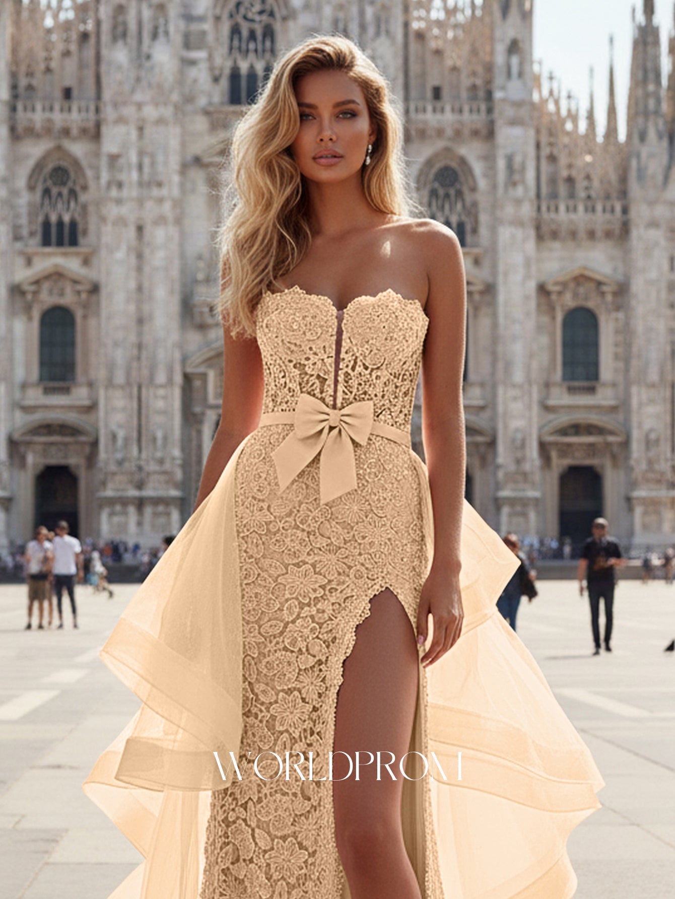 This lace prom gown features bow front with cut front sheer on the illusion bodice. The strapless dress has a sweetheart neckline and split hem with waist drop. Worldprom mermaid prom dresses are ideal for party, evening or festivals.