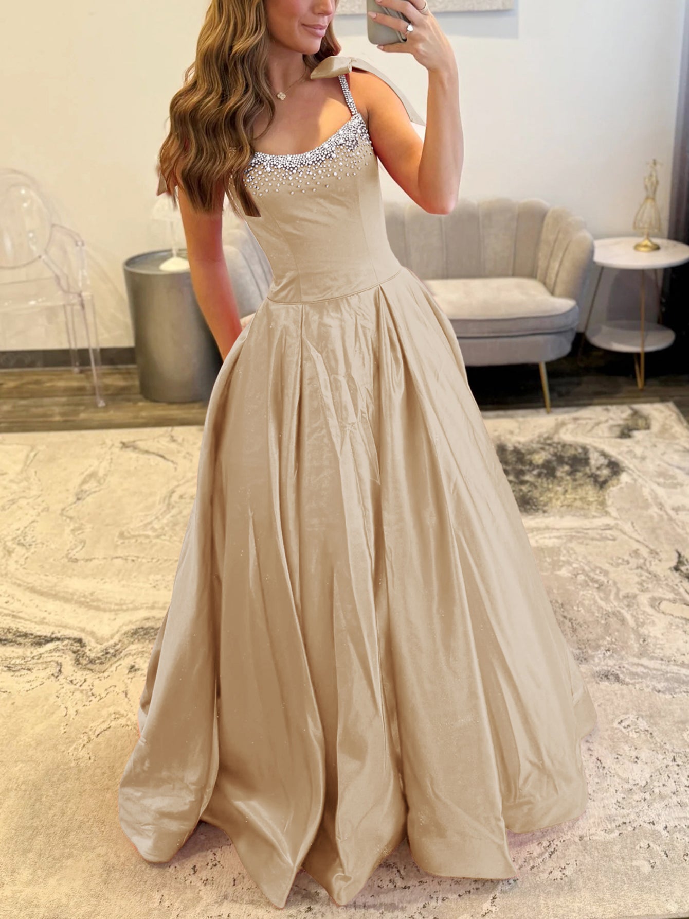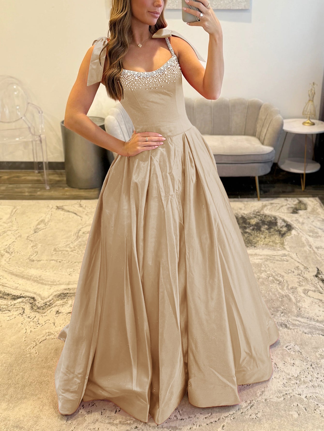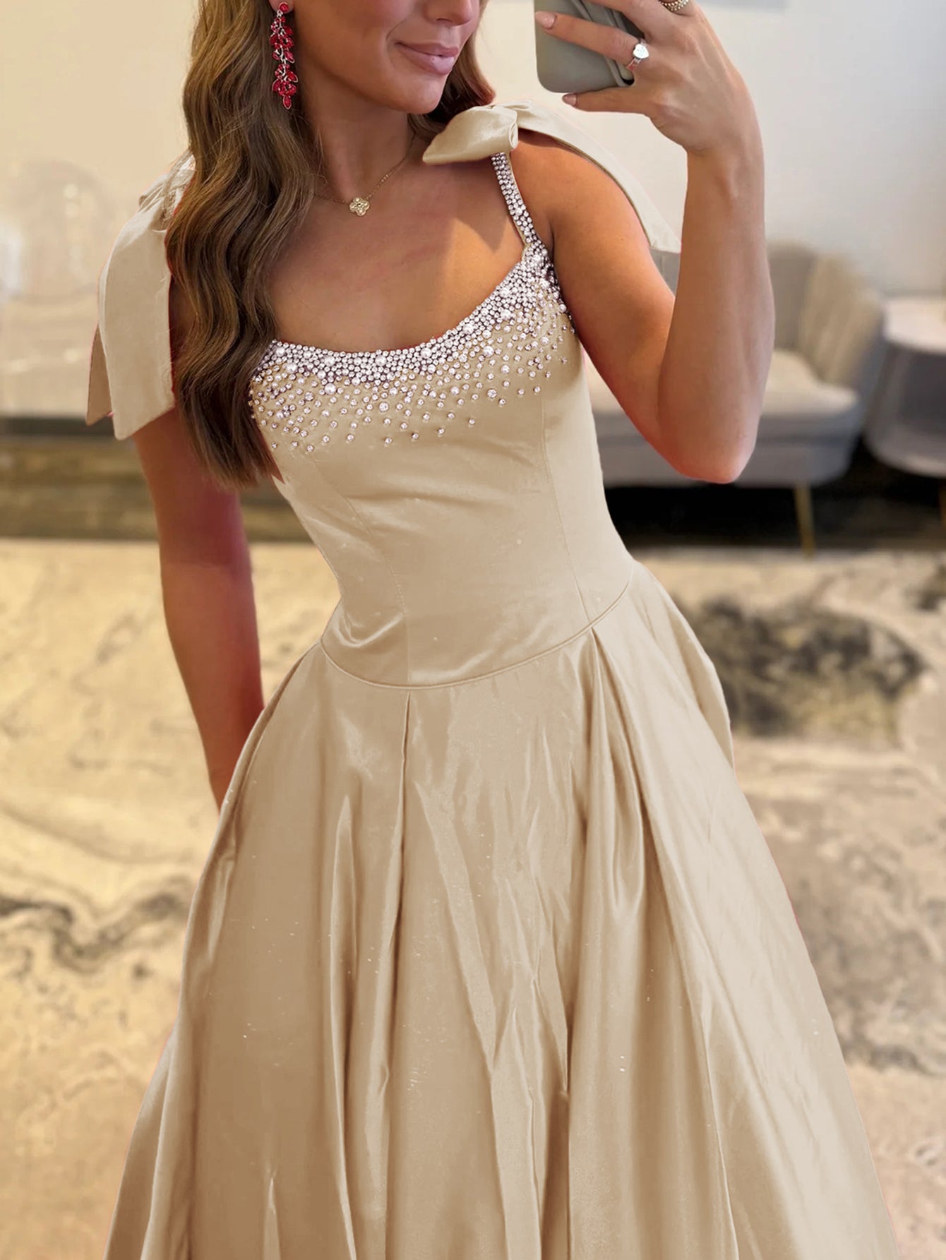 This satin prom gown features hand-beading with bows on the bodice. The long evening dress has a scoop neckline and ball gown hem. This formal dress is ideal for party, evening or festivals.