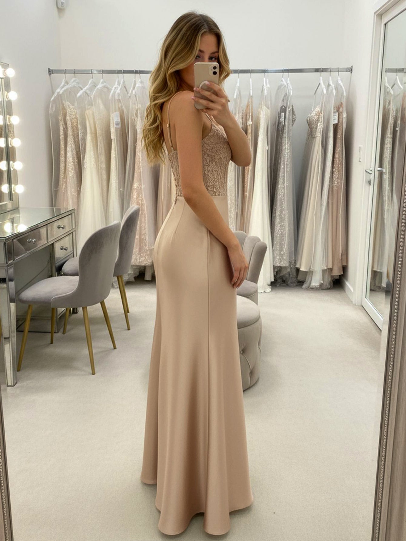 Lace Embroidery Twist Mermaid Long Prom Dress - Champagne
