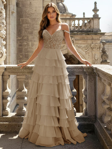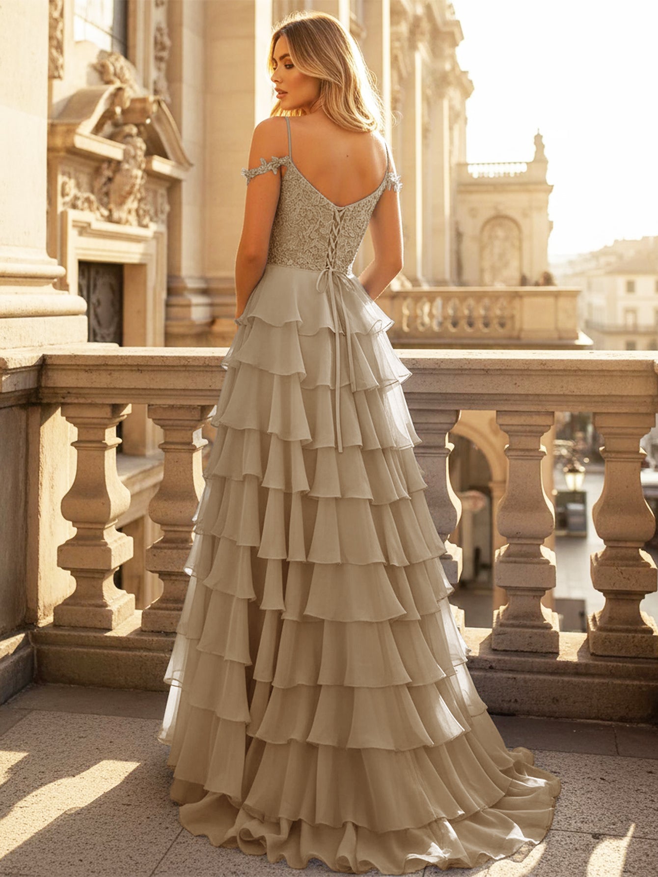Lace Illusion Ruffle Tiered Ball Gown Prom Dress - Champagne