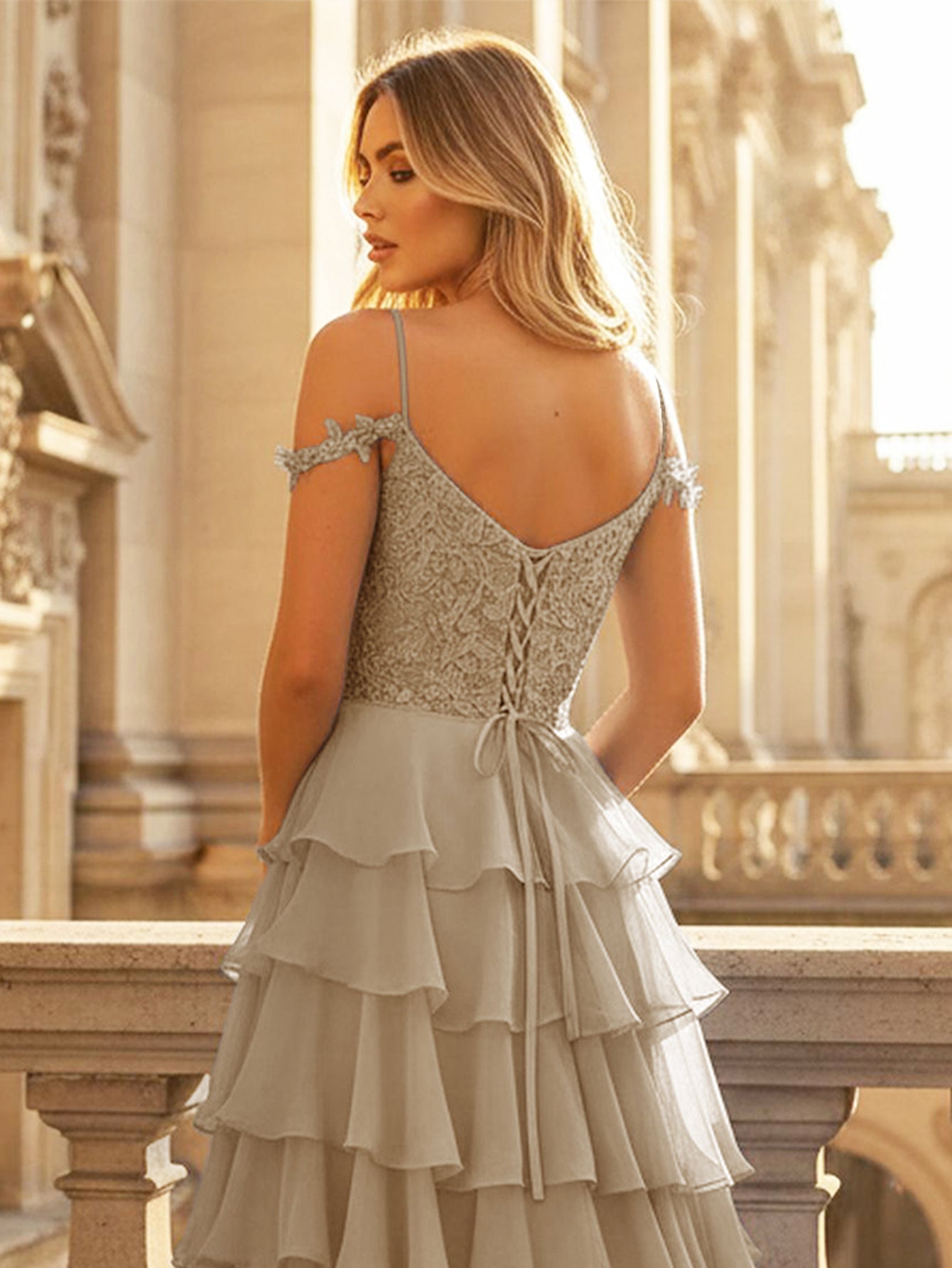 Details: Backless, Lace, Split, Ruffled, Spaghetti Shoulder Straps, Hot Fix, Beading, Tiered
