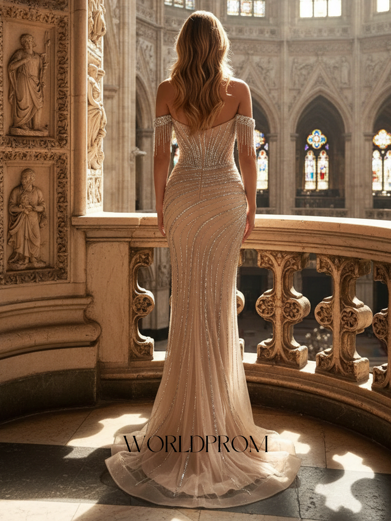 This crystal dress features tassels beading with sheer on the illusion bodice. The off-shoulder dress has a sweetheart neckline and split hem. Mermaid luxury prom dresses are ideal for party, evening or festivals.