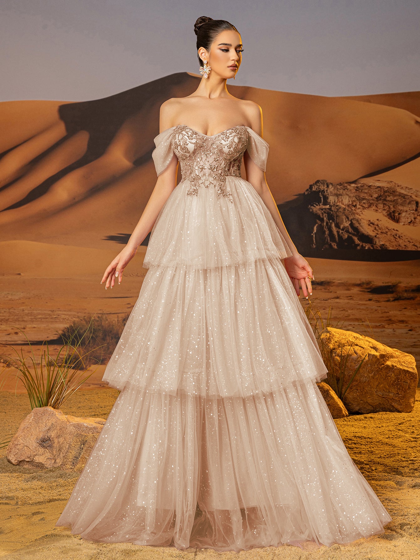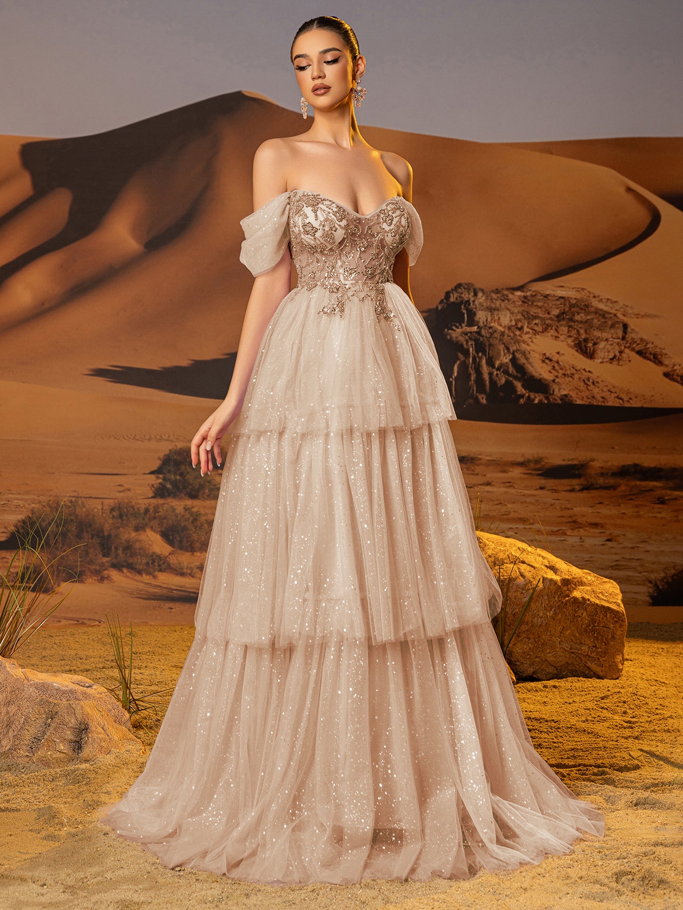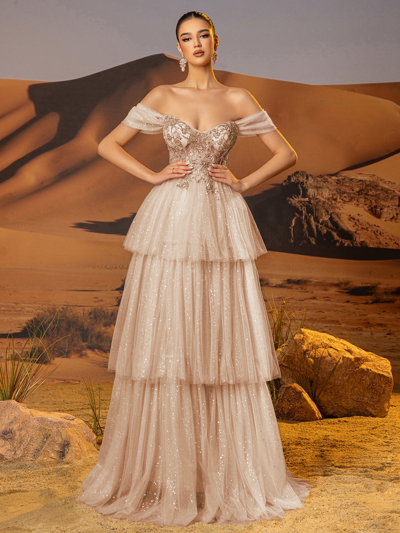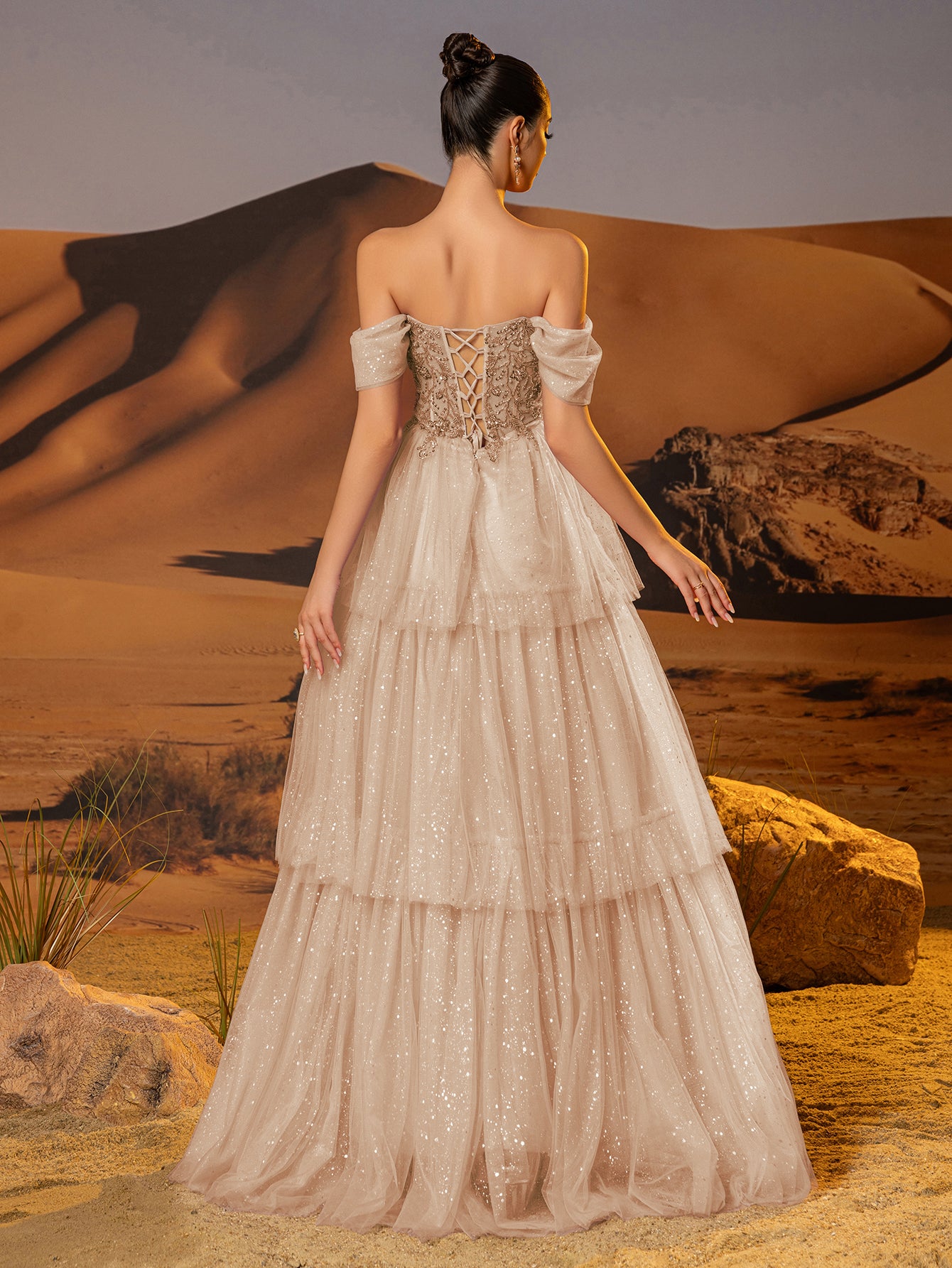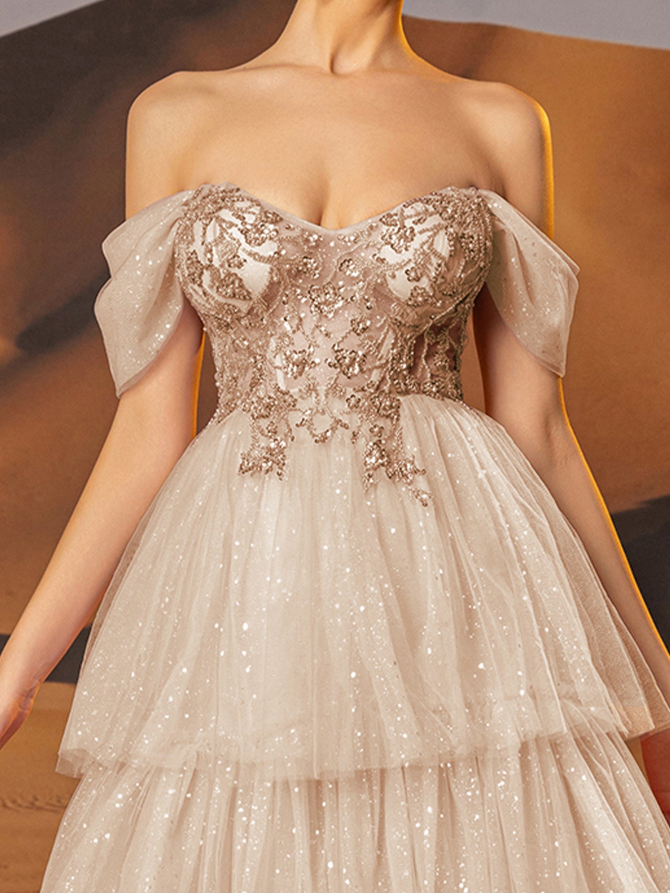 Off Shoulder Sparkly Lace Embroidery Layered Ball Gown Prom Dress - Champagne