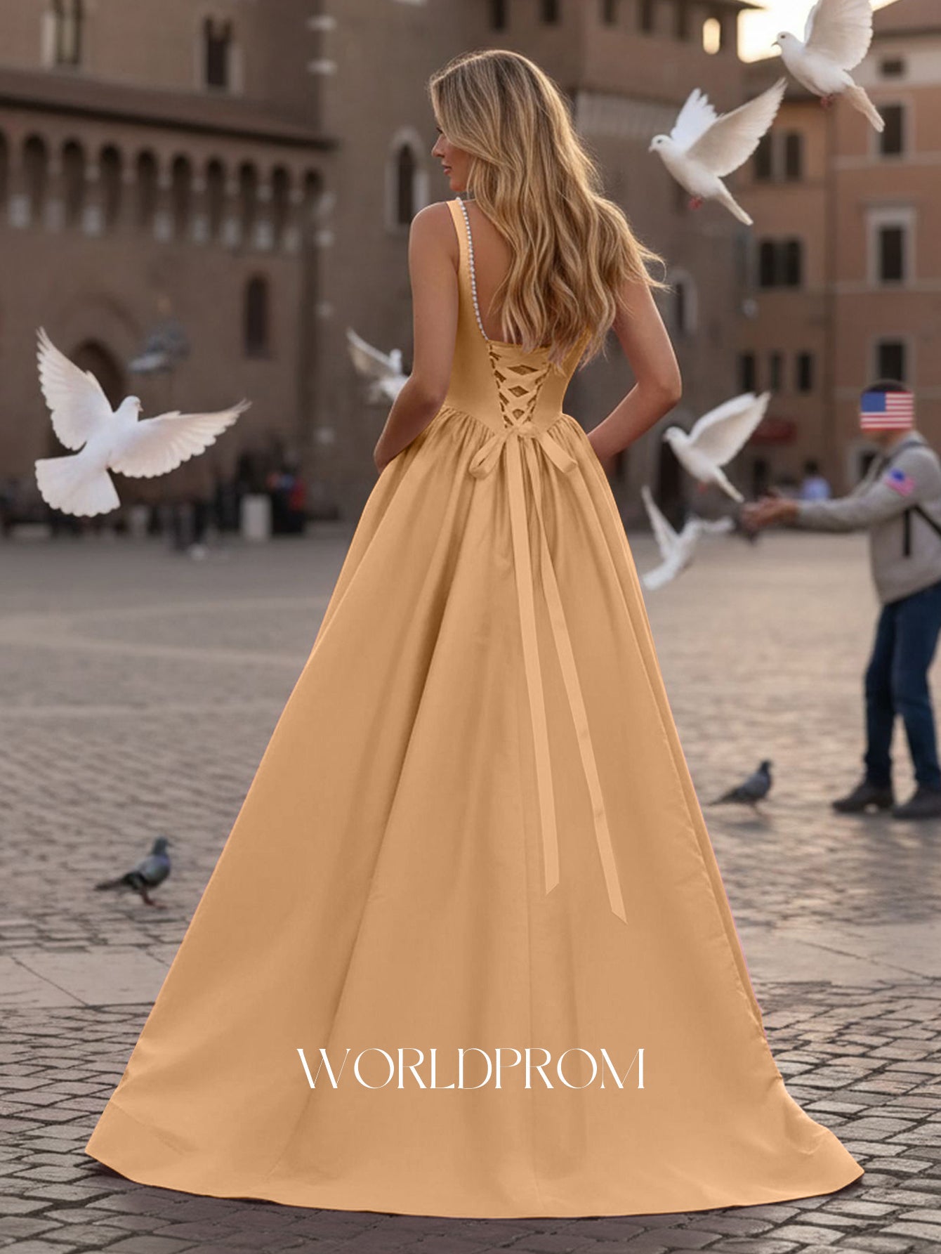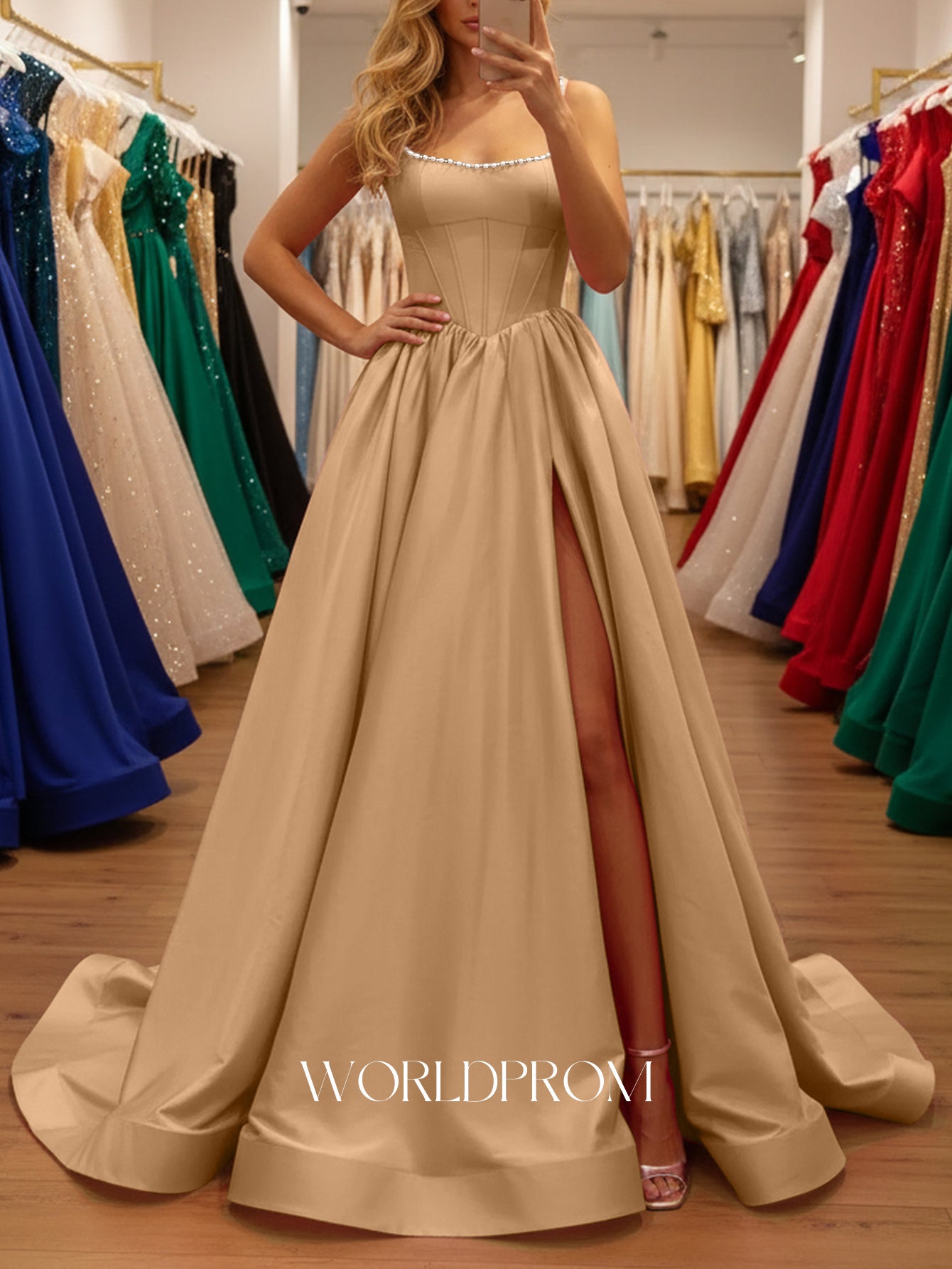 This satin prom gown features corset with pearls like on the bodice. The lace up dress has a square neckline and split hem. Worldprom ball gown prom dresses are ideal for party, evening or festivals.
