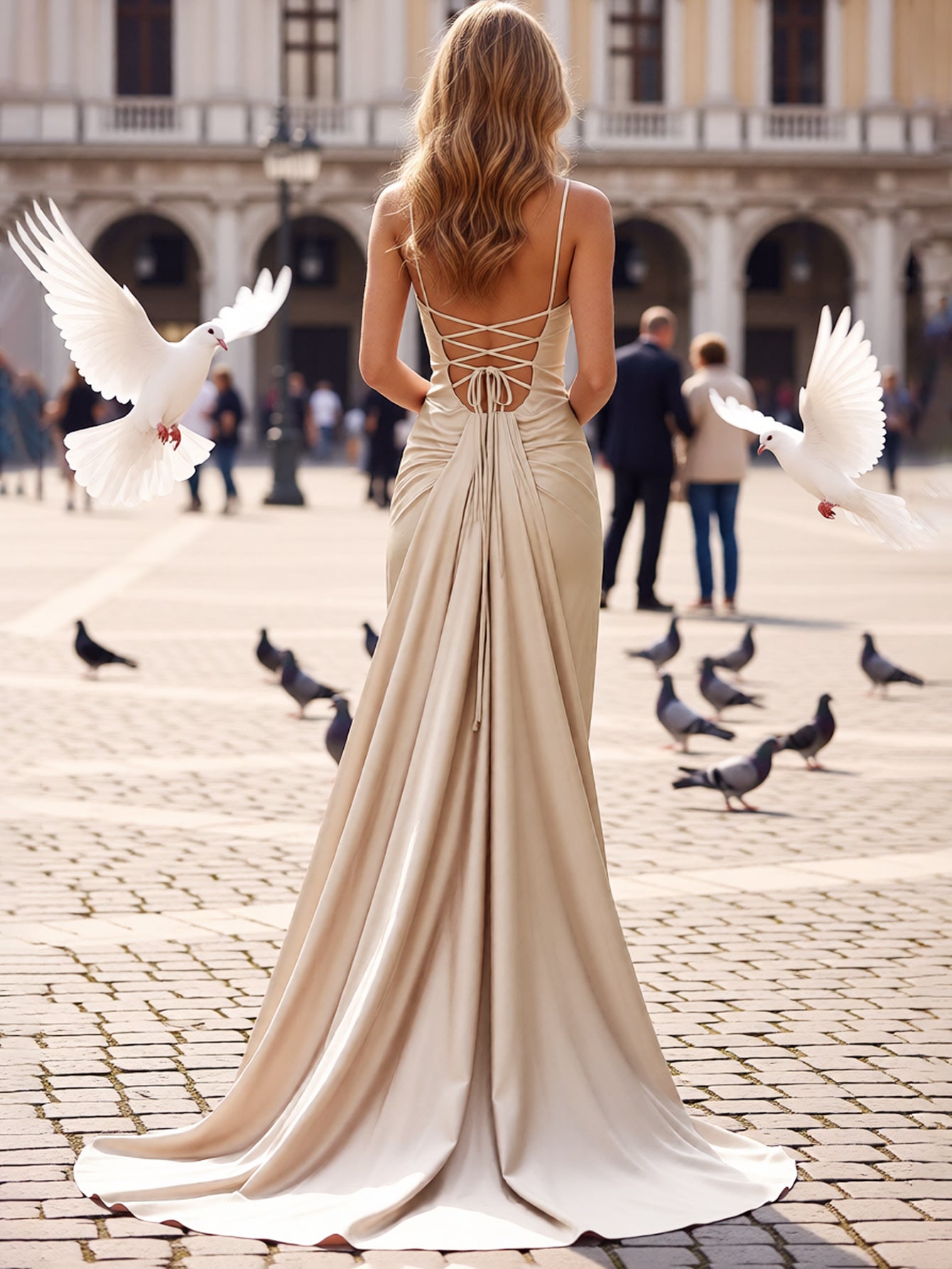 Details: Backless, Sparkly, Beading, Ruched, Lace Up, Drop Train