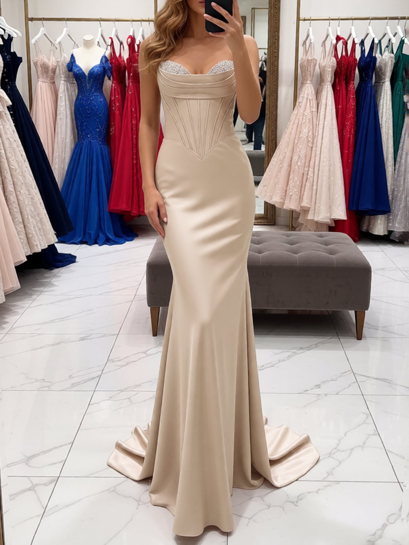Sparkly Beading Bodice Long Mermaid Prom Dress With Removable Drop Train - Champagne