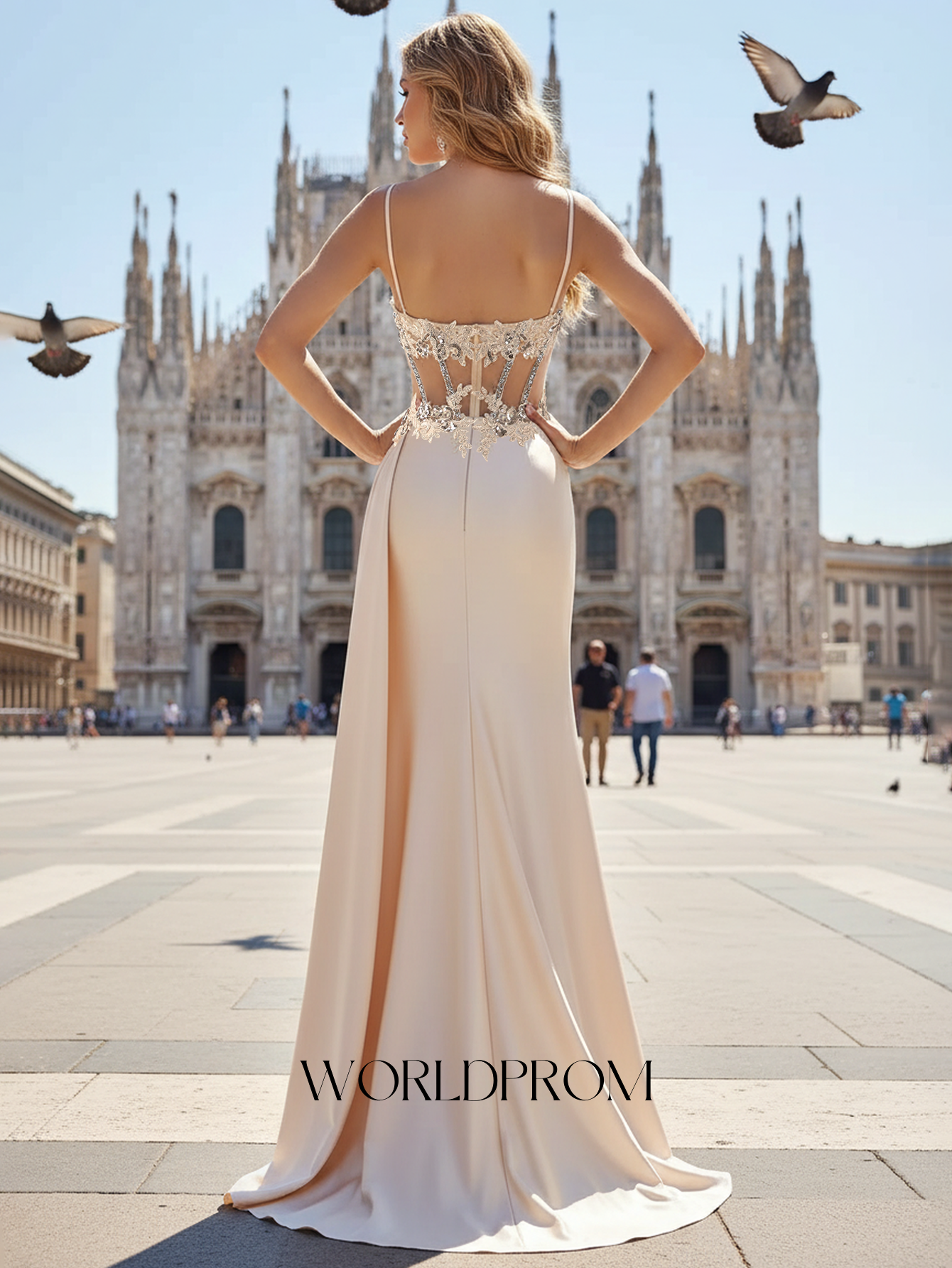 Sparkly Beading Illusion Spaghetti Shoulder Straps Mermaid Long Prom Dress - Champagne