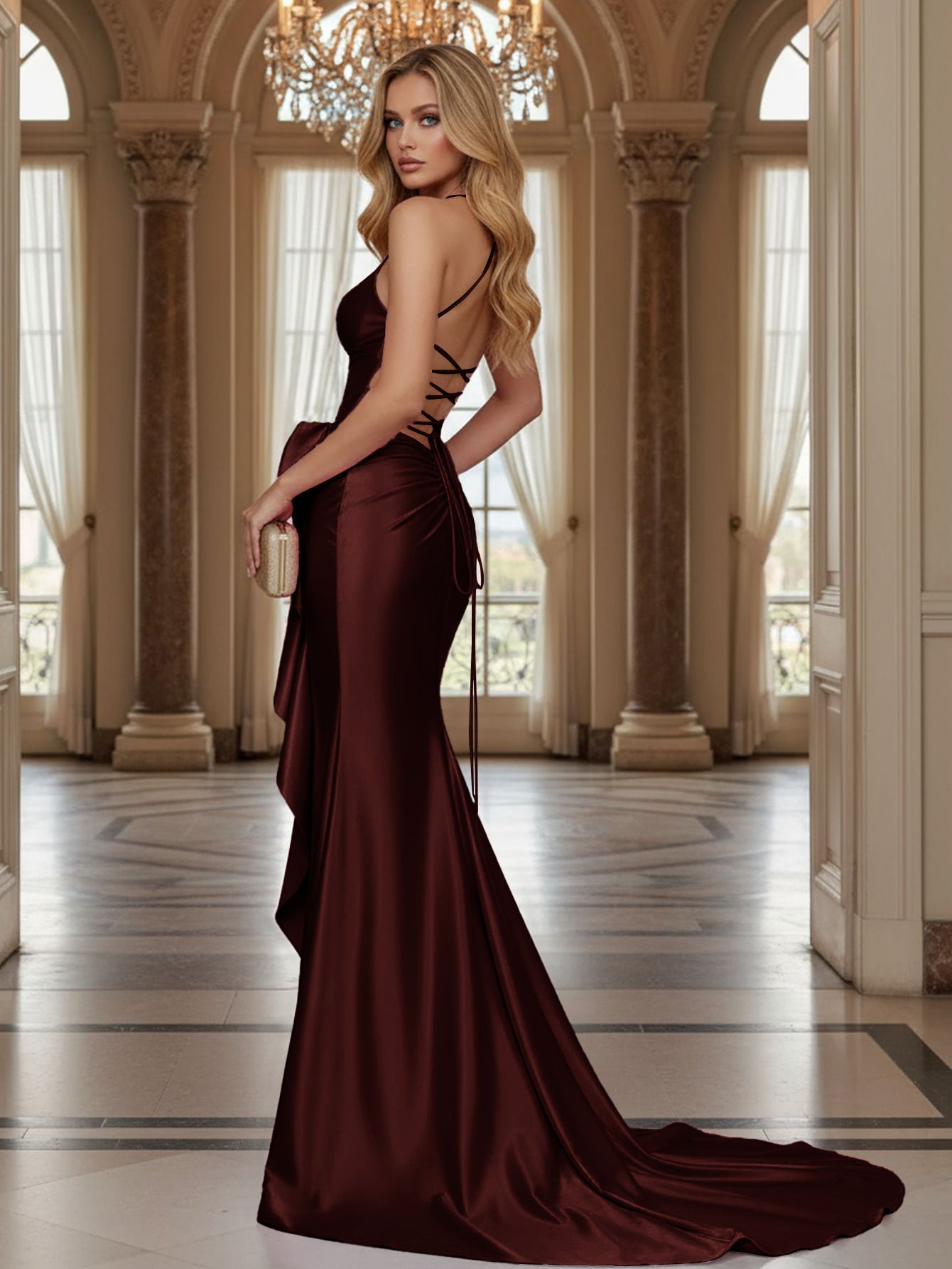 Bow Waist Spaghetti Strap Ruffle Mermaid Prom Dress With Slit - Burgundy