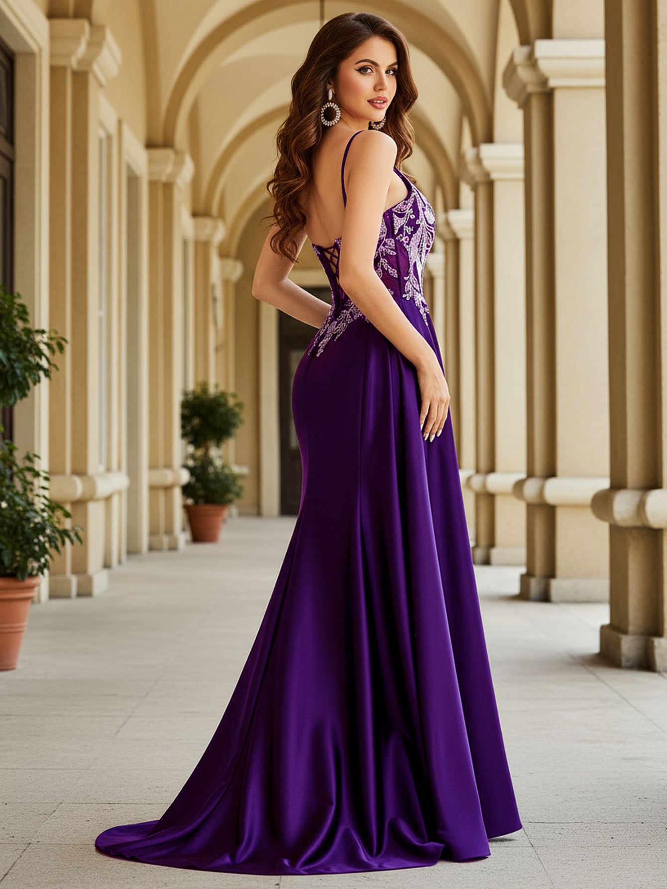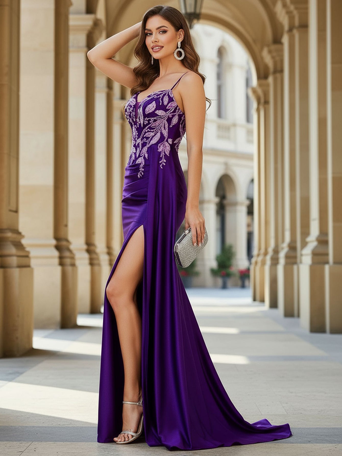 This satin gown features beaded embroidery on the bodice. The spaghetti strap dress for prom has a v-neck and split hem. This ?black trumpet dress is ideal for party, evening or festivals.