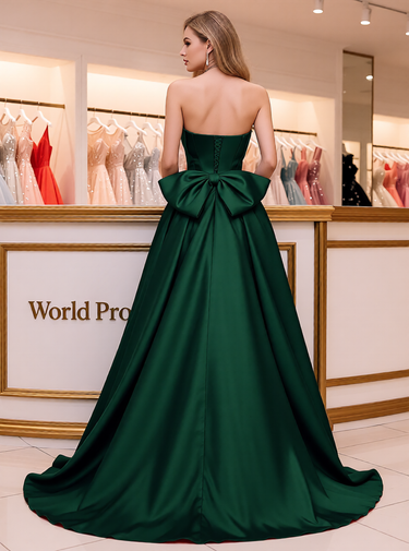 Pleated Bust Ruffle Hem Strapless Satin Prom Ball Gown - Emerald Green