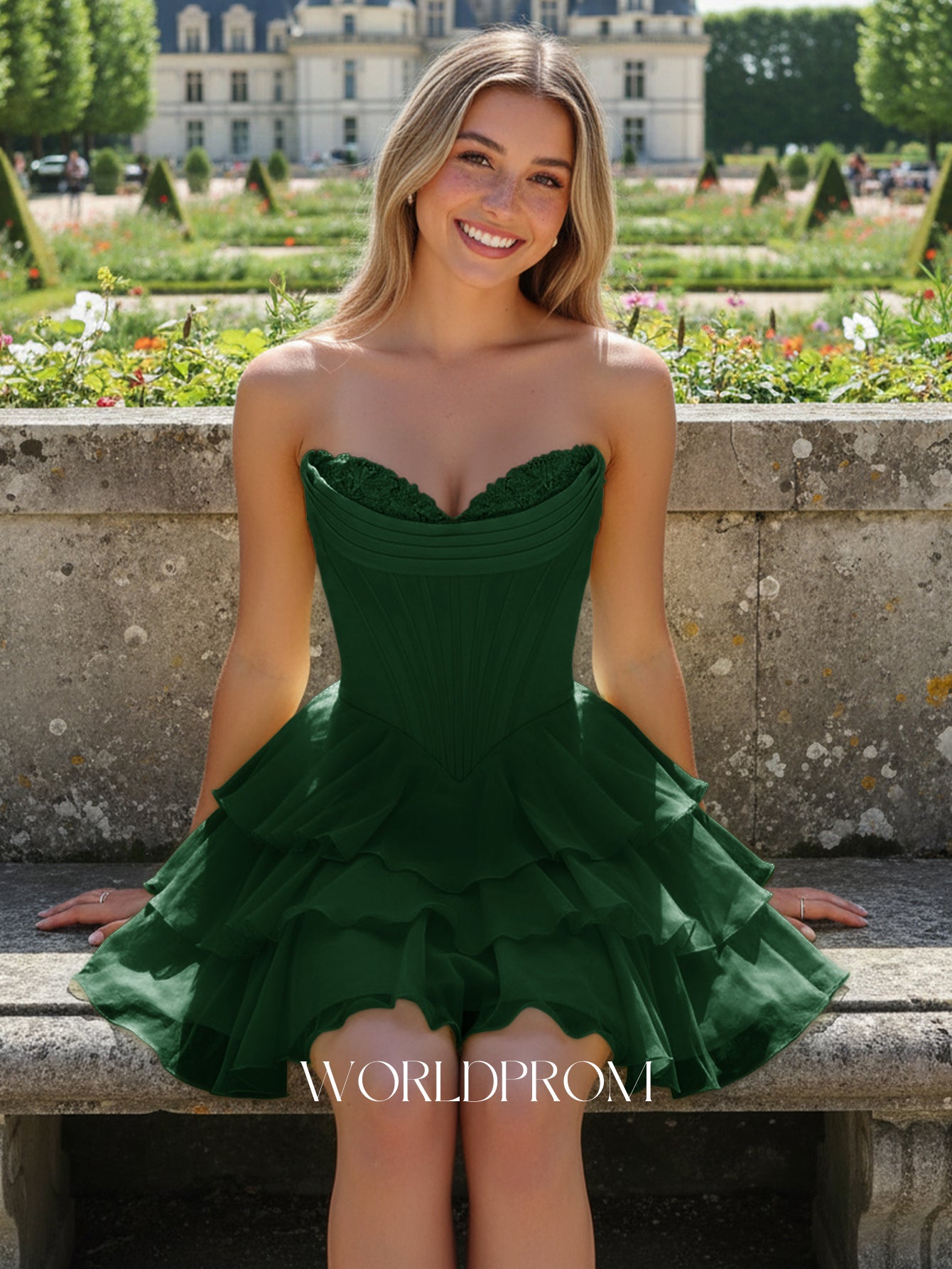 This chiffon short prom dress features boned on the bodice. The strapless mini dress has a sweetheart neck and ruffle layered hem. The sexy hoco dress is ideal for graduation party, homecoming or prom party.
