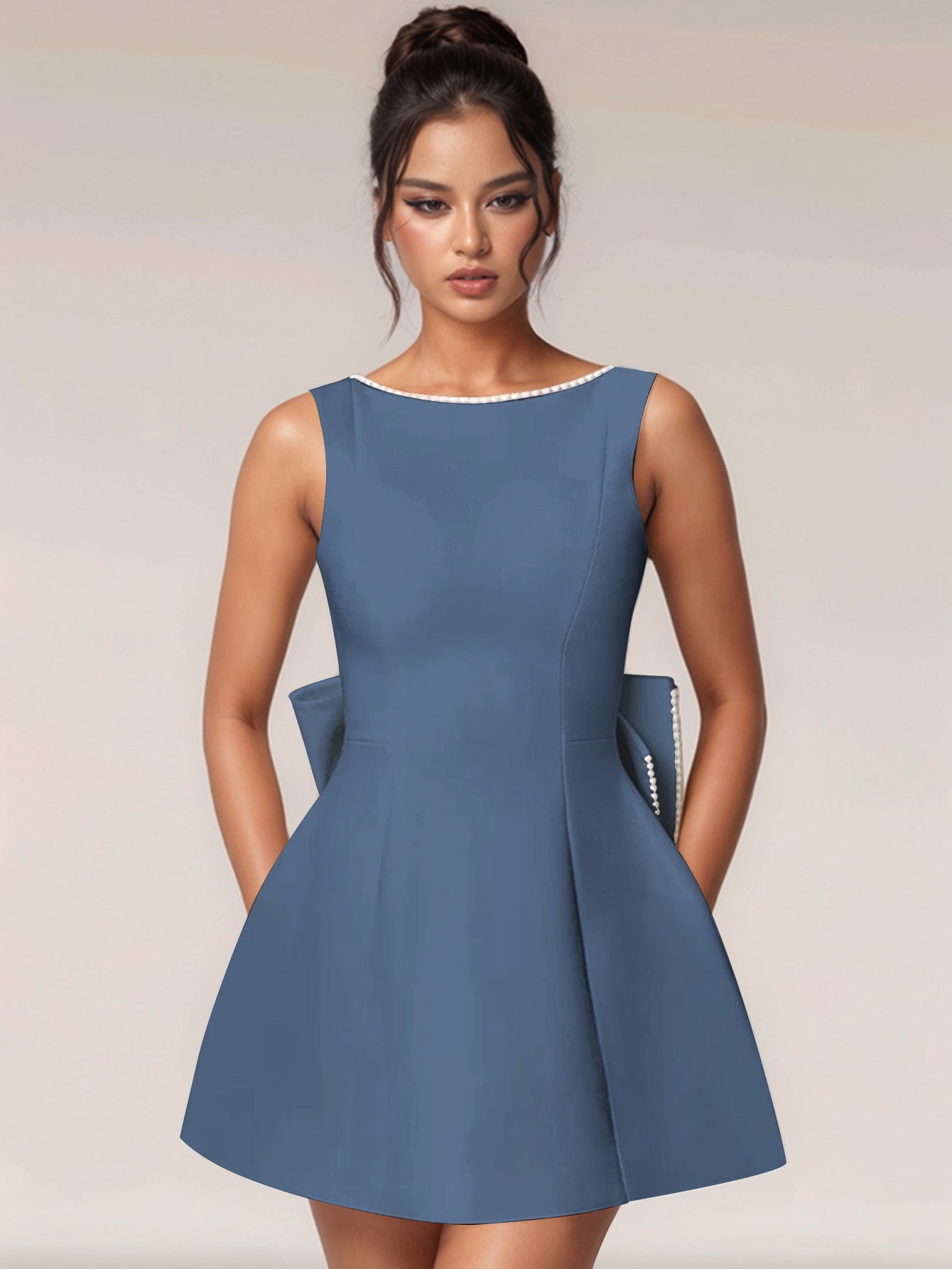 Hand Beading Backless Bow Ball Gown Prom Bridal Mini Dress - Dusty Blue
