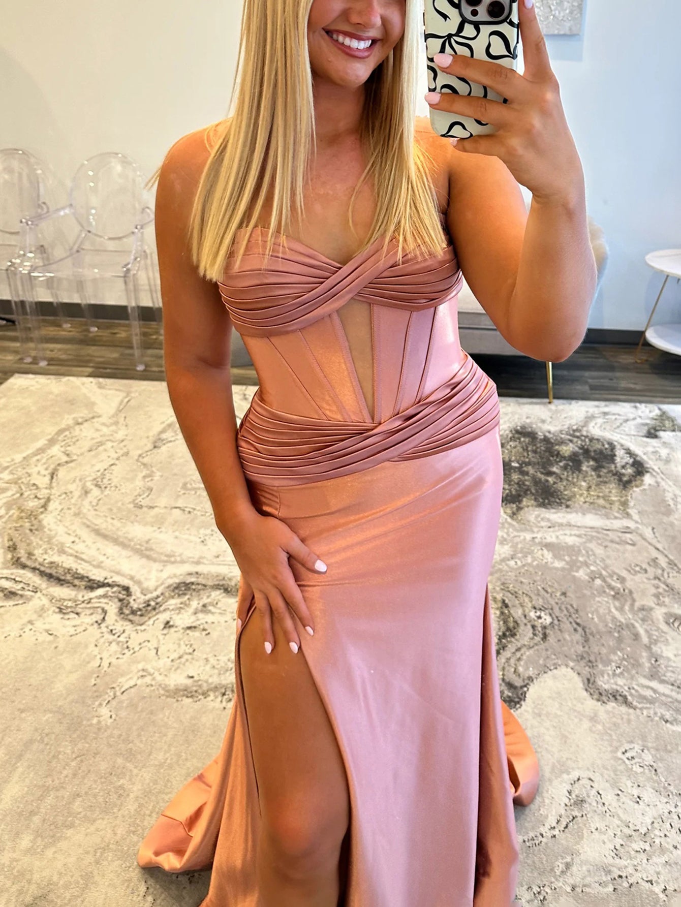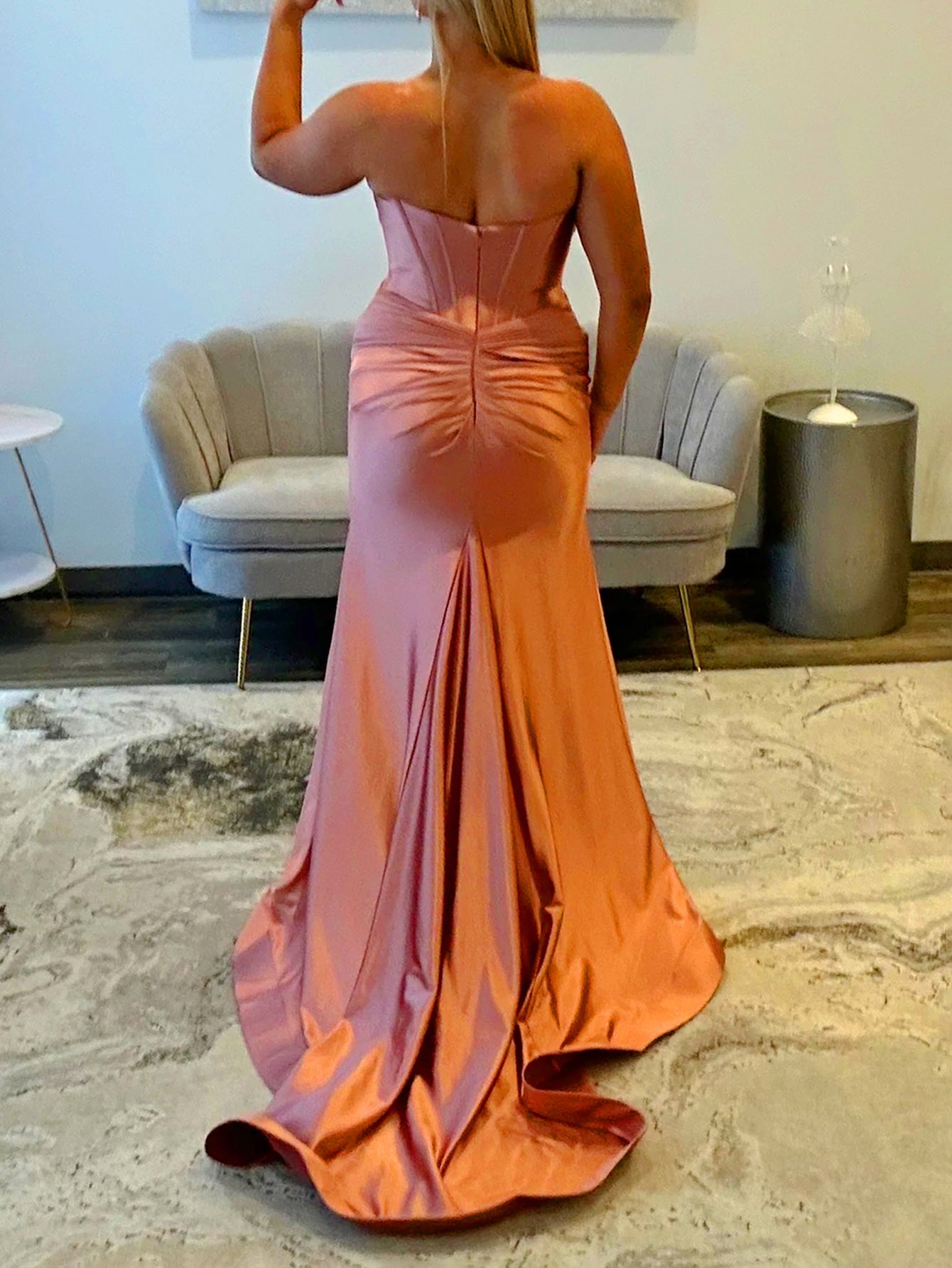 Details: Backless, Cut Front, Split, Boned, Pleated