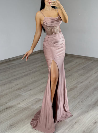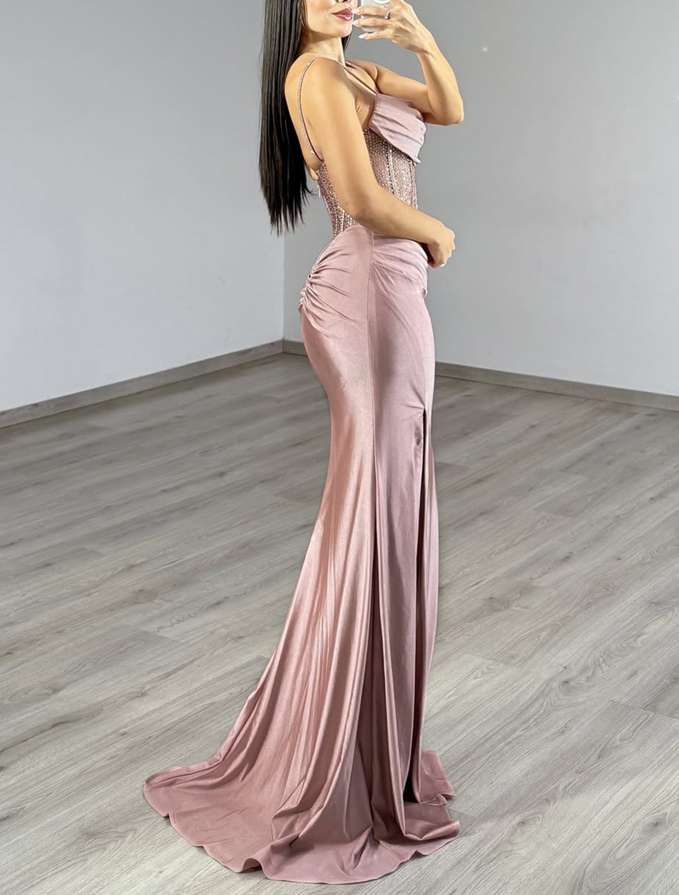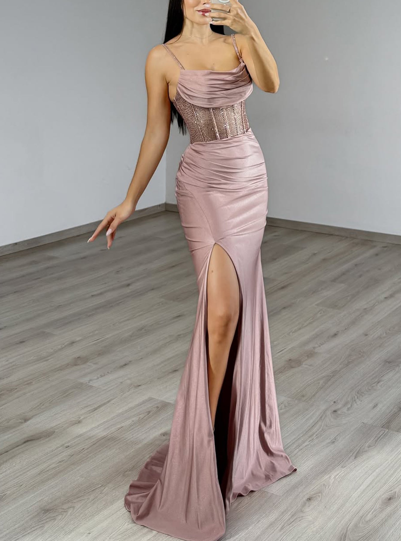 This modern prom dress features ruched bust and sheer net with crystal on the bodice. The spaghetti straps prom dress has a scoop neckline and a pleated split hem. This 2025 new sheath prom dress is ideal for party, evening or homecoming events.