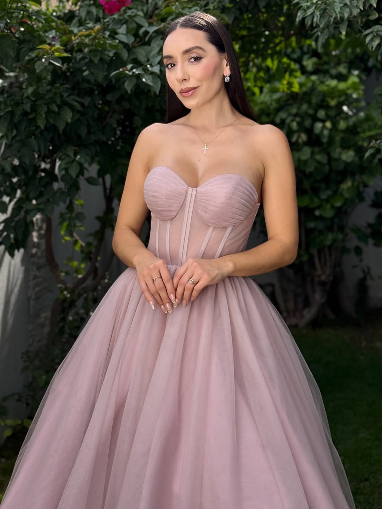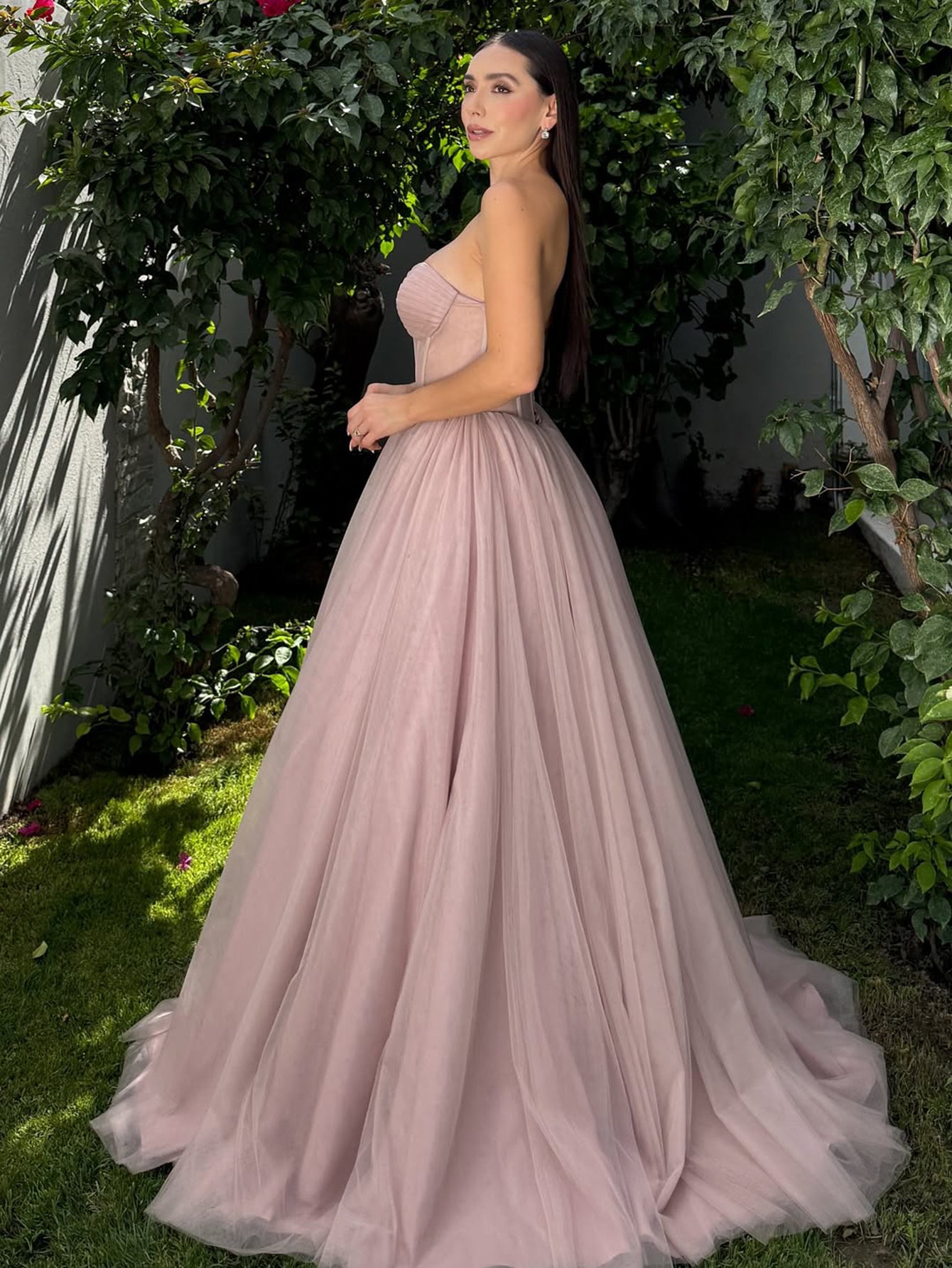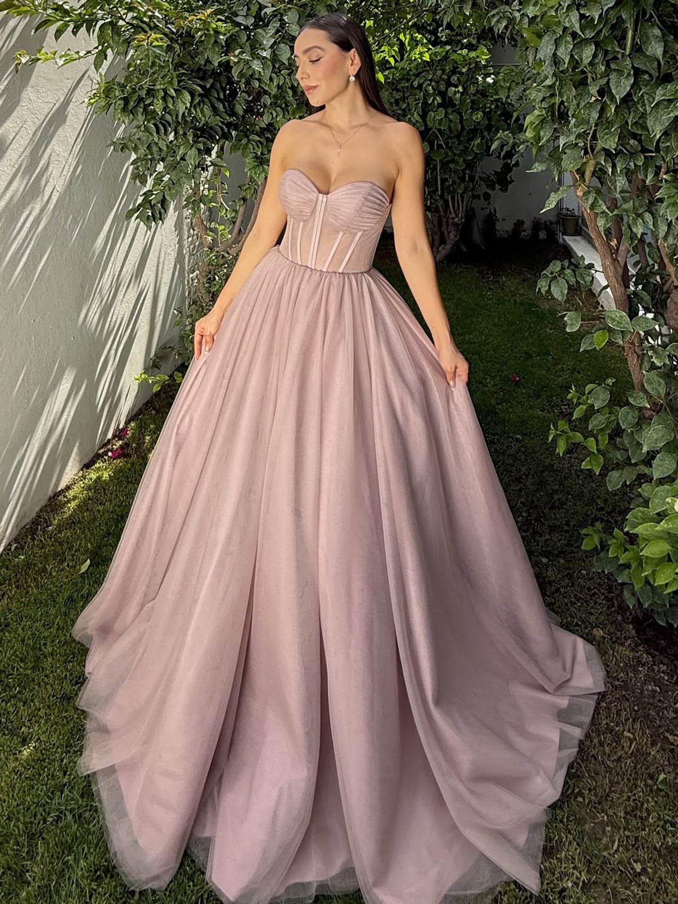 This tulle prom gown features ruched bust with sheer on the illusion bodice. The strapless dress has a sweetheart neckline and pleated hem. Worldprom ball gown prom dresses are ideal for party, evening or festivals.