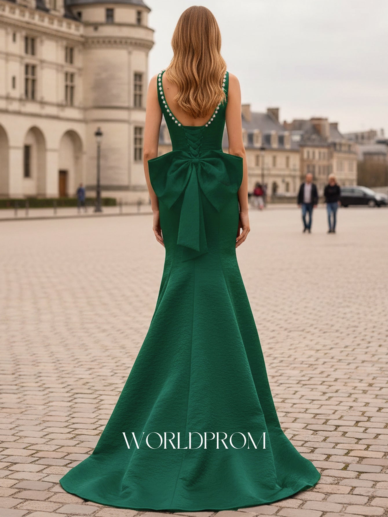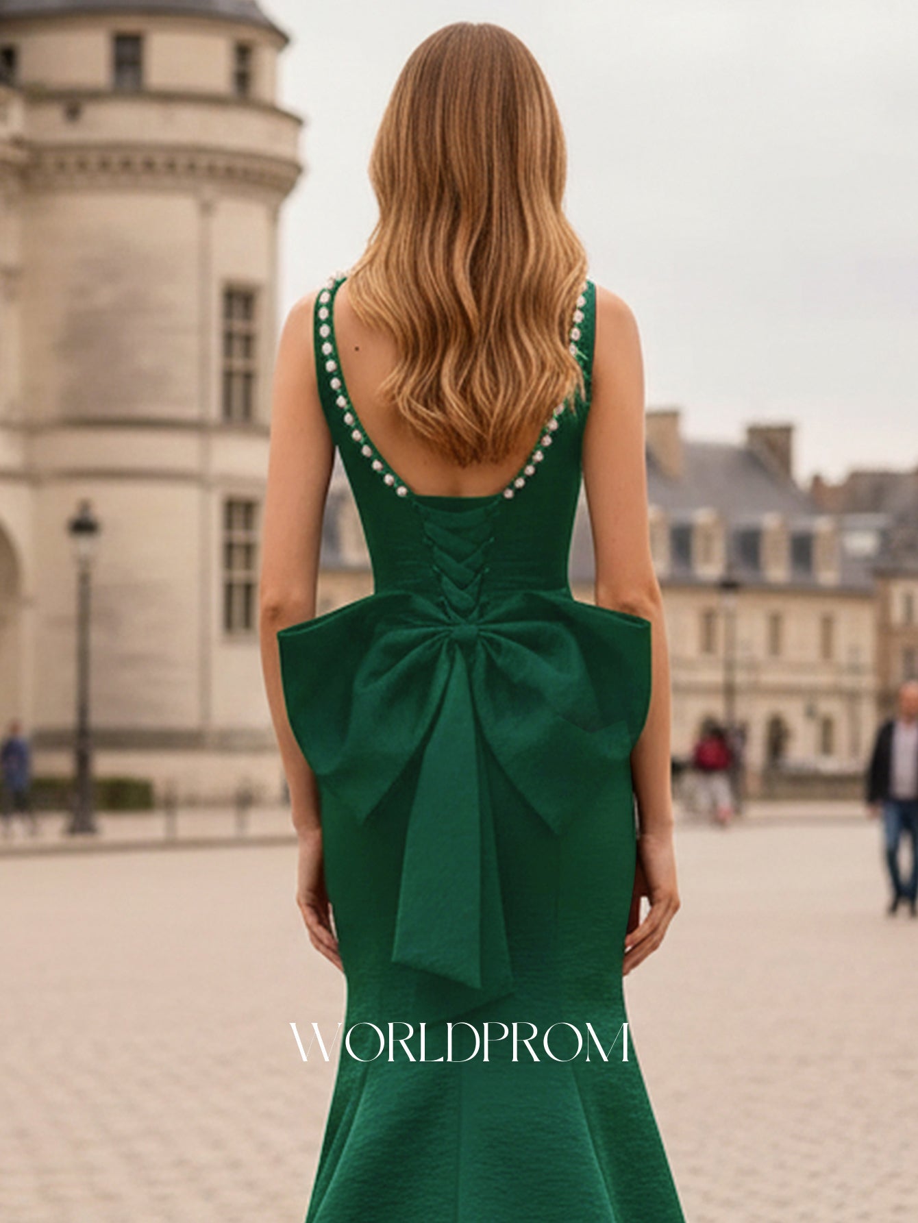 Big Bow Back Tank Square Beading Mermaid Satin Elegant Long Prom Dress - Emerald Green