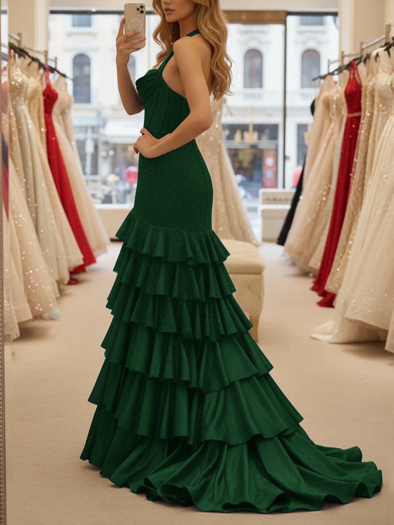 Halter Hot Fix Crystal Ruffle Hem Lace Up Long Prom Dress Mermaid With Slit - Emerald Green