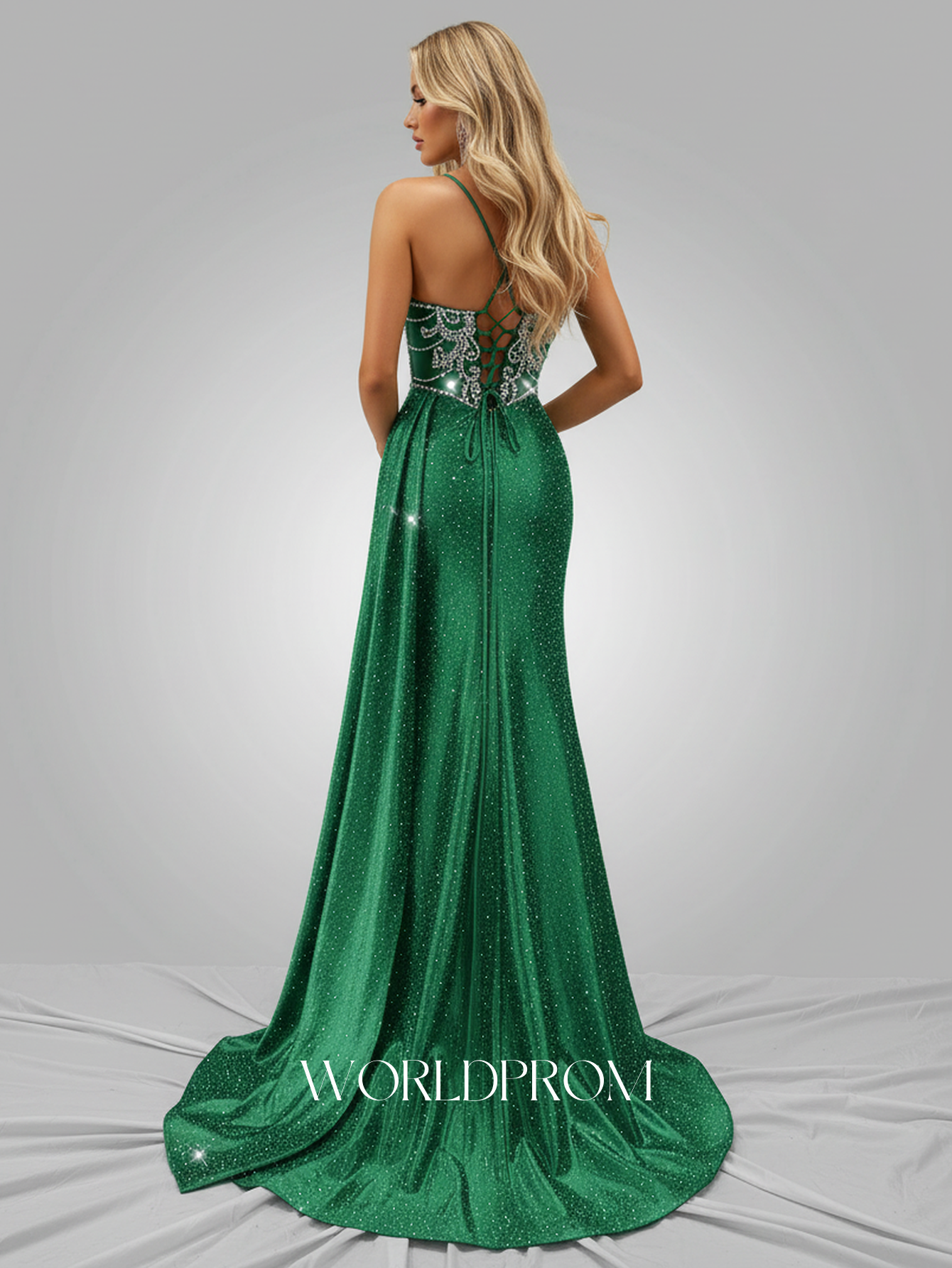 Luxury Lace Embroidery Crystal Mermaid Prom Dress With Waist Drop - Emerald Green