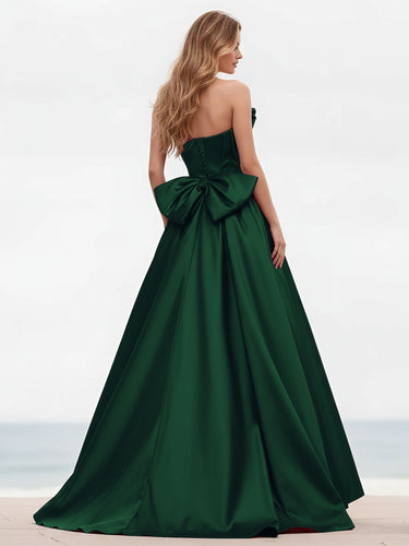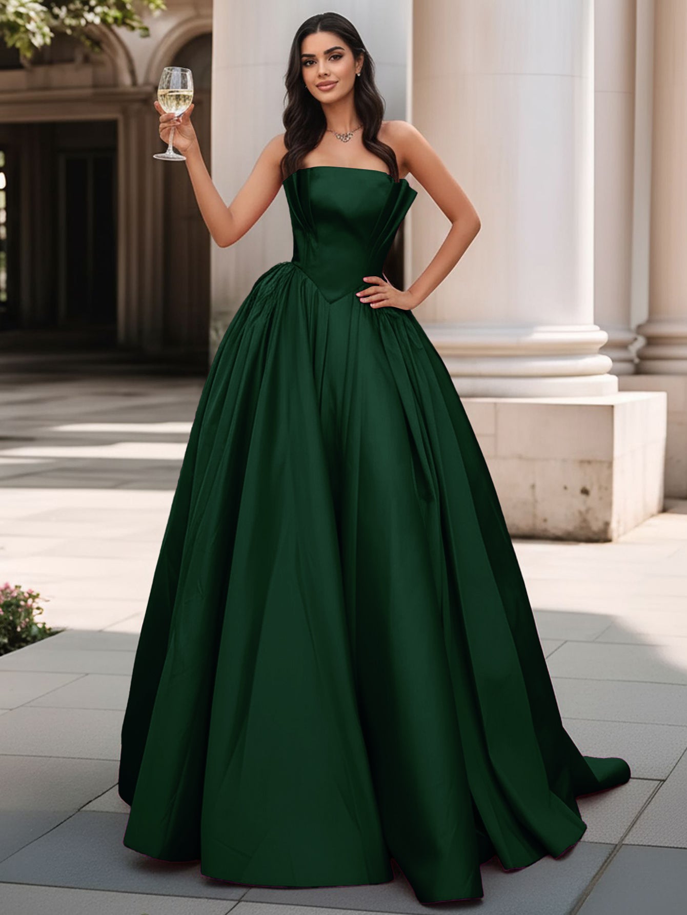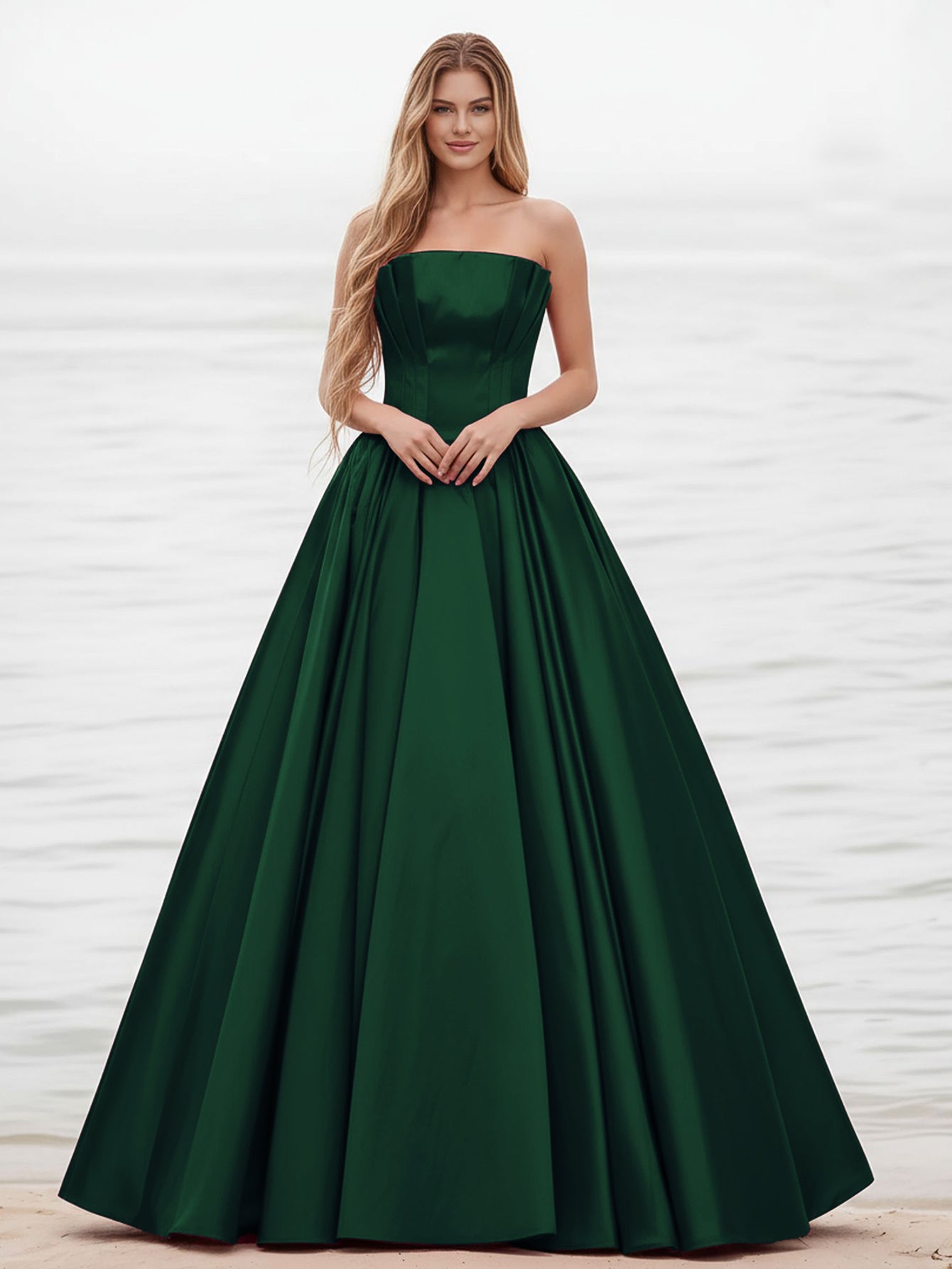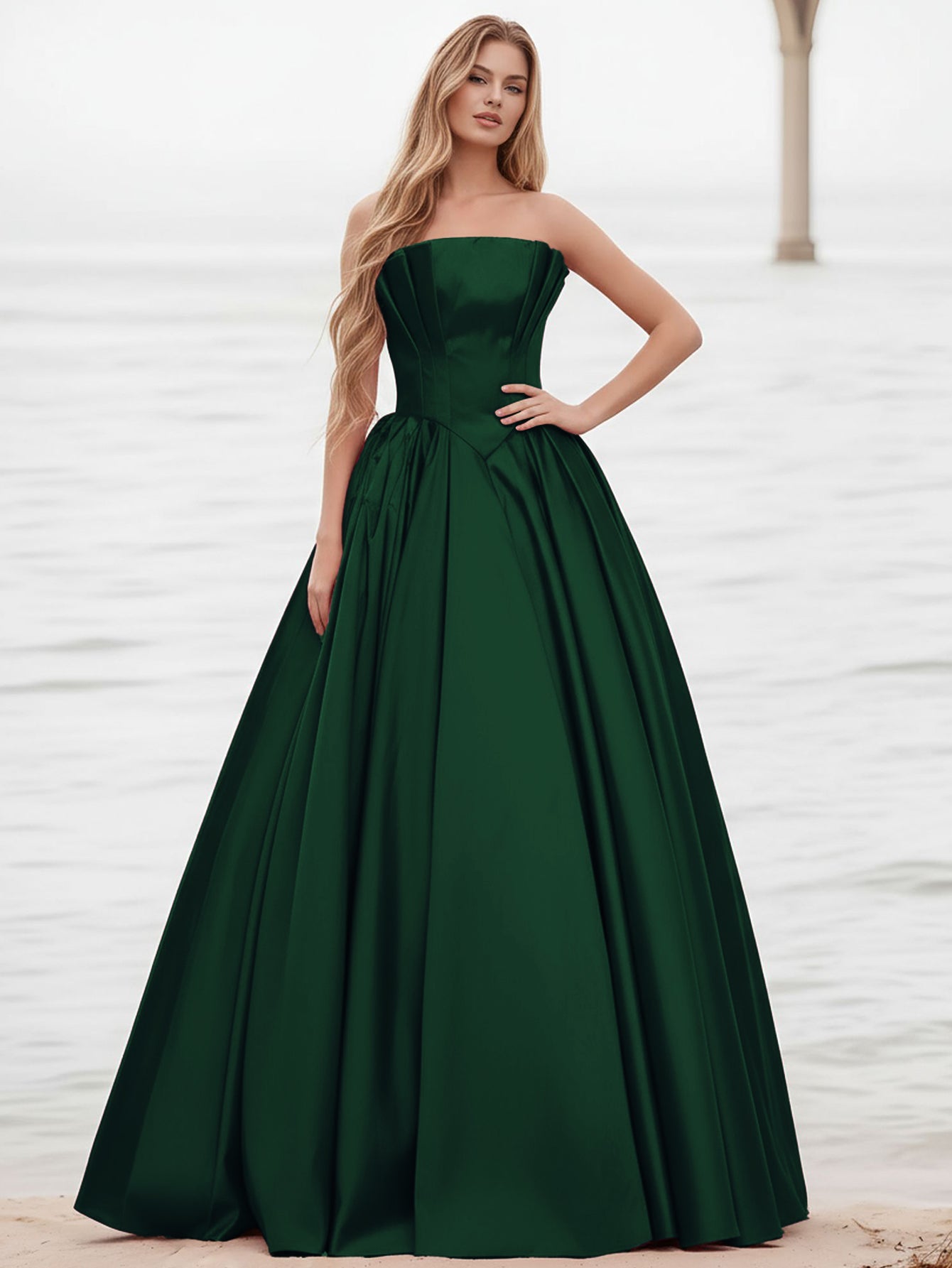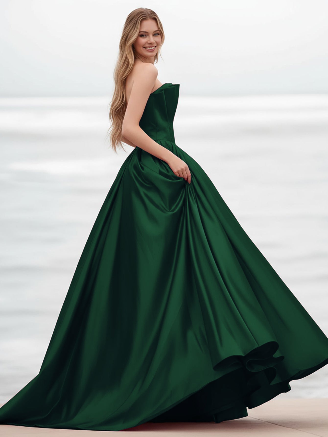 Pleated Bust Ruffle Hem Strapless Satin Prom Ball Gown - Emerald Green
